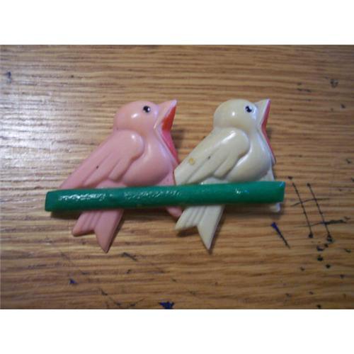 This is an old celluloid -two birds on a branch-pin.The cream colored bird has a tiny dot of I believe paint on him.I am sure this will come off easy but was not sure what to use so left it alone.Measures almost 3" across,No damage.Very fragile.
