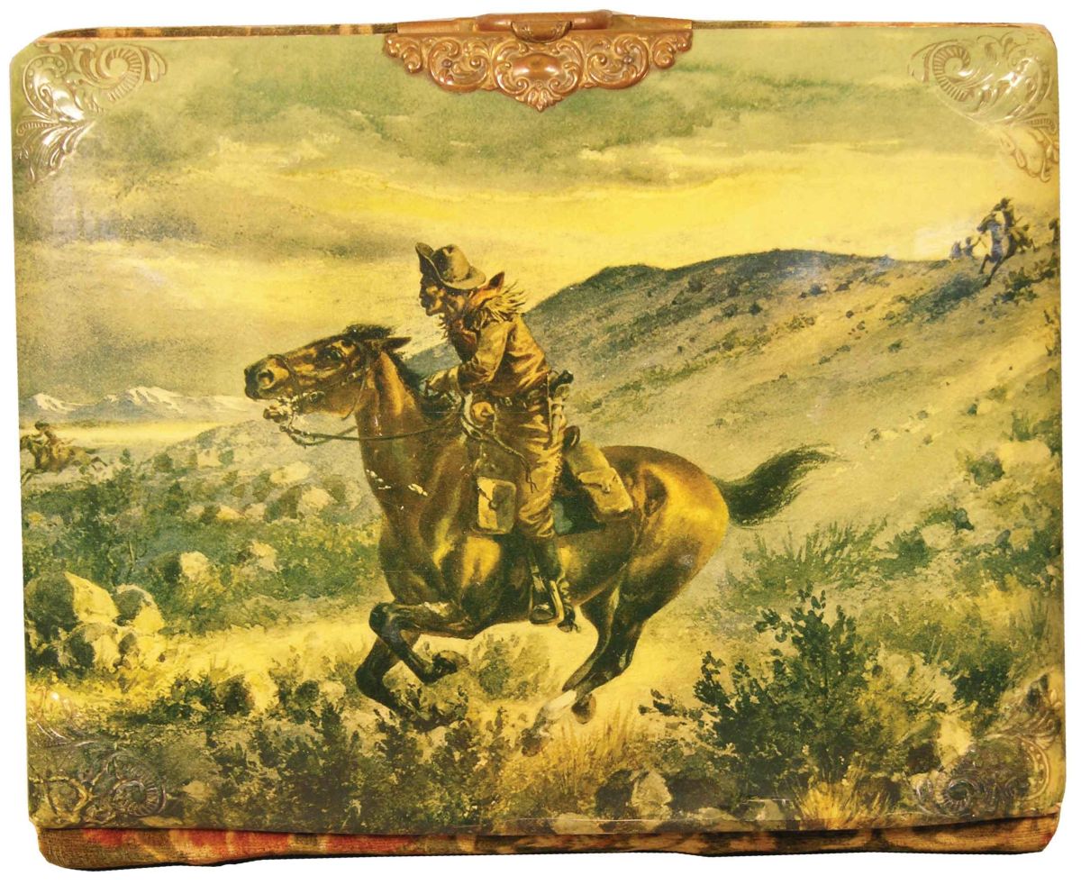 Celluloid Covered Photo Album with Pony Express Scene. Original clasp, crack along the bottom otherwise very good condition. 11 1/2 X 9 X 2 1/4 inches. Start Price $60