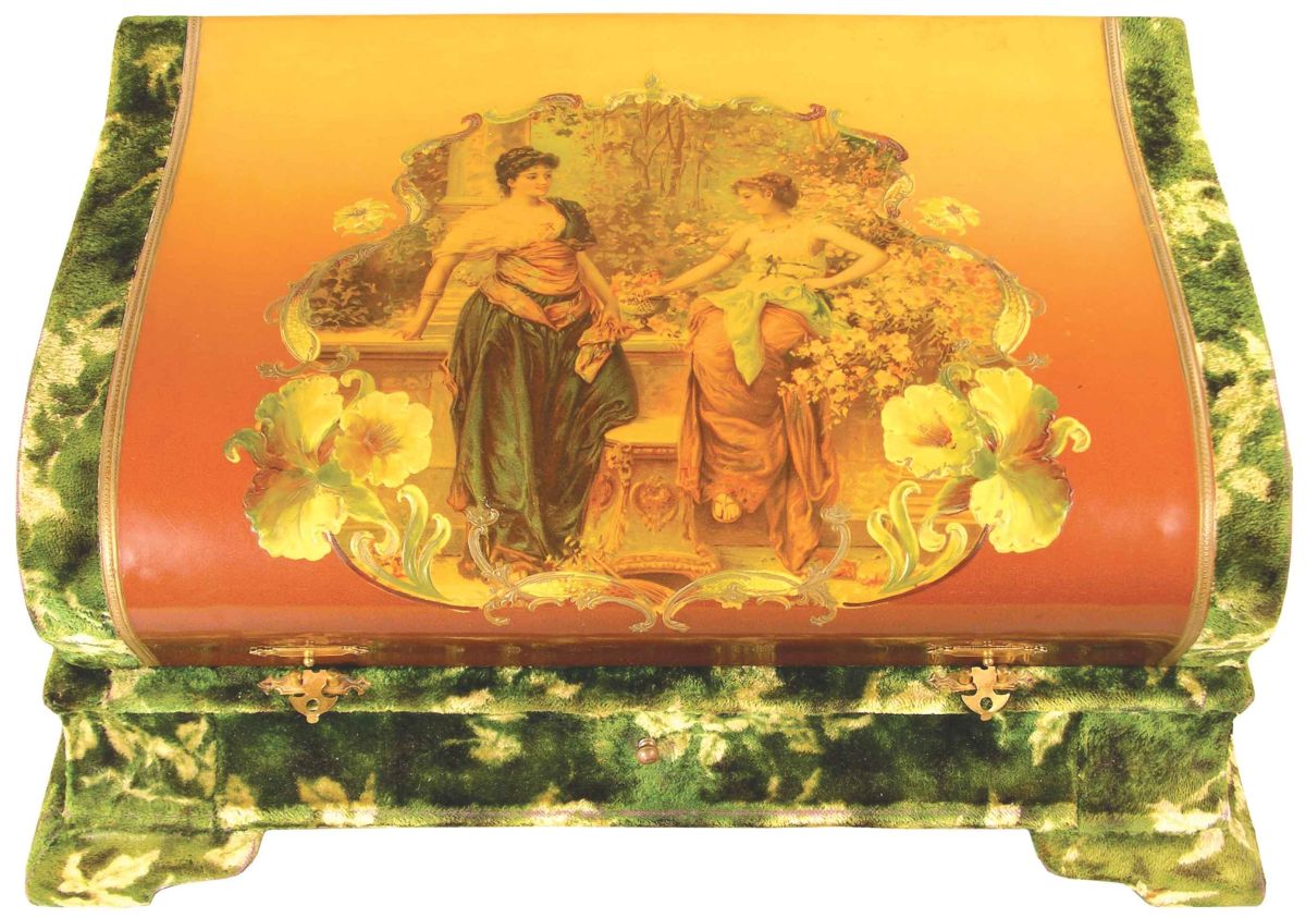 Celluloid Dresser Box depicting Edwardian Women with floral velvet trim. Complete with accessories and front drawer. Excellent condition. 17 1/2 X 8 X 10 1/2 inches. Start Price $100