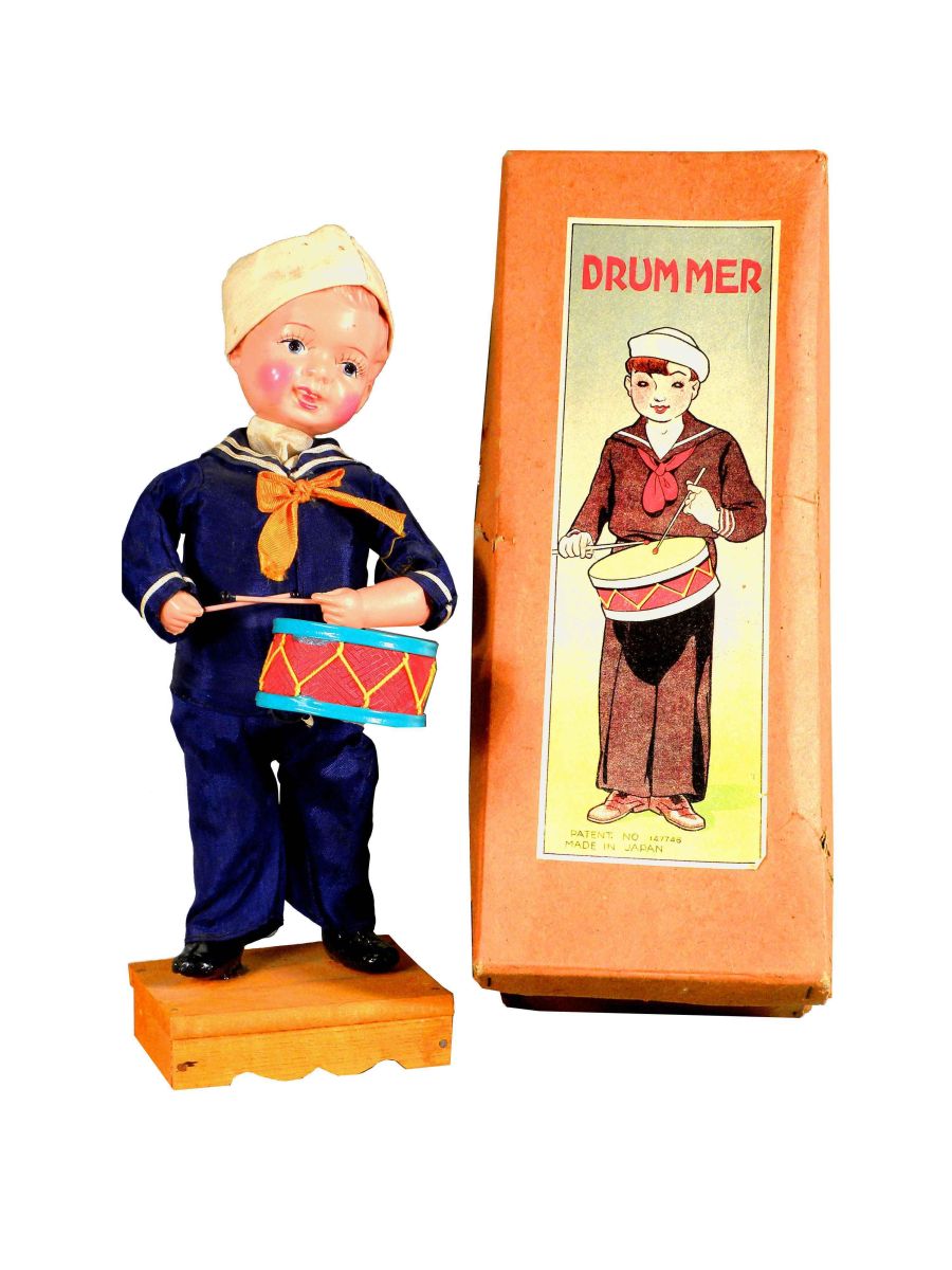 Celluloid Drummer Boy Toy in original box. Made in Japan. Excellent condition. 10 1/2 inches tall.