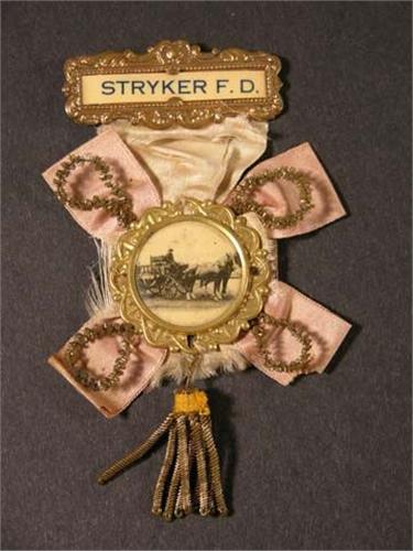 Celluloid fire fighting pin - Styker Fire Dept., Photo of horse drawn hose wagon, 5.5" long.