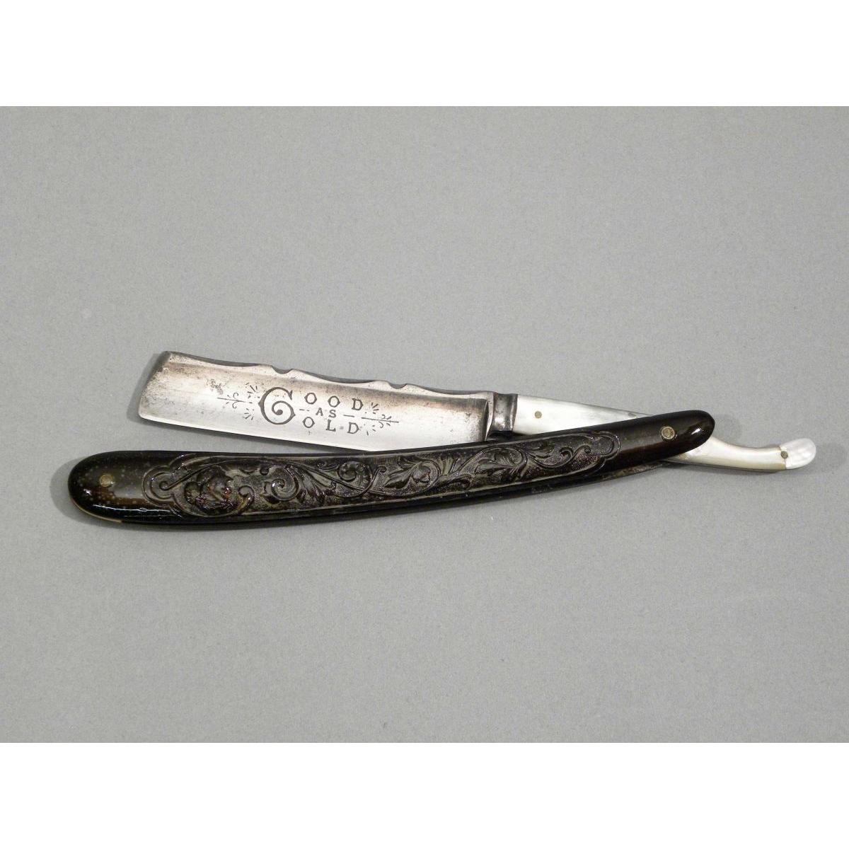 Celluloid Handled Straight Razor with Victorian motif. Mother of Pearl tang. Blade is scalloped and etched with "Good as Gold". Excellent condition. N