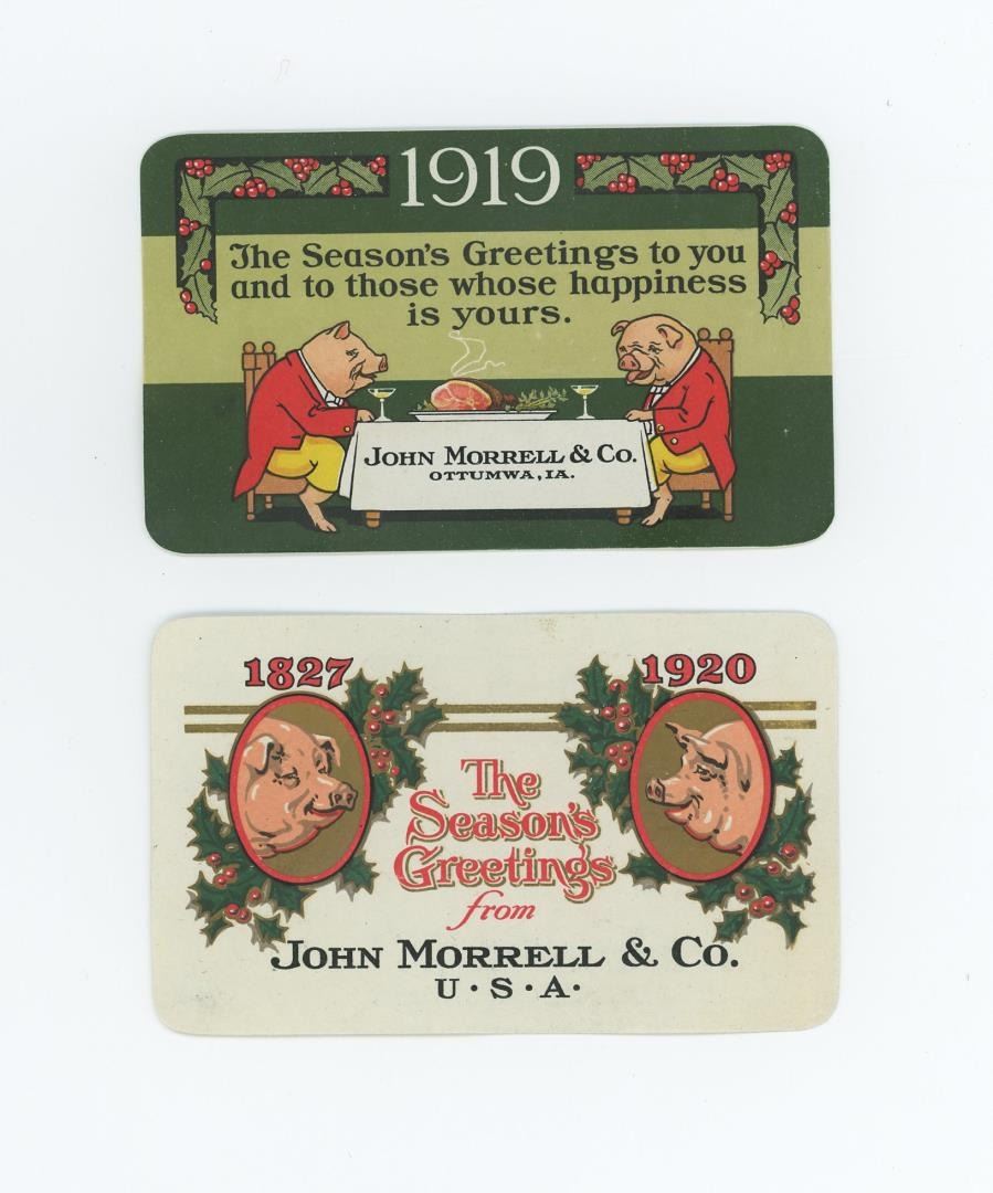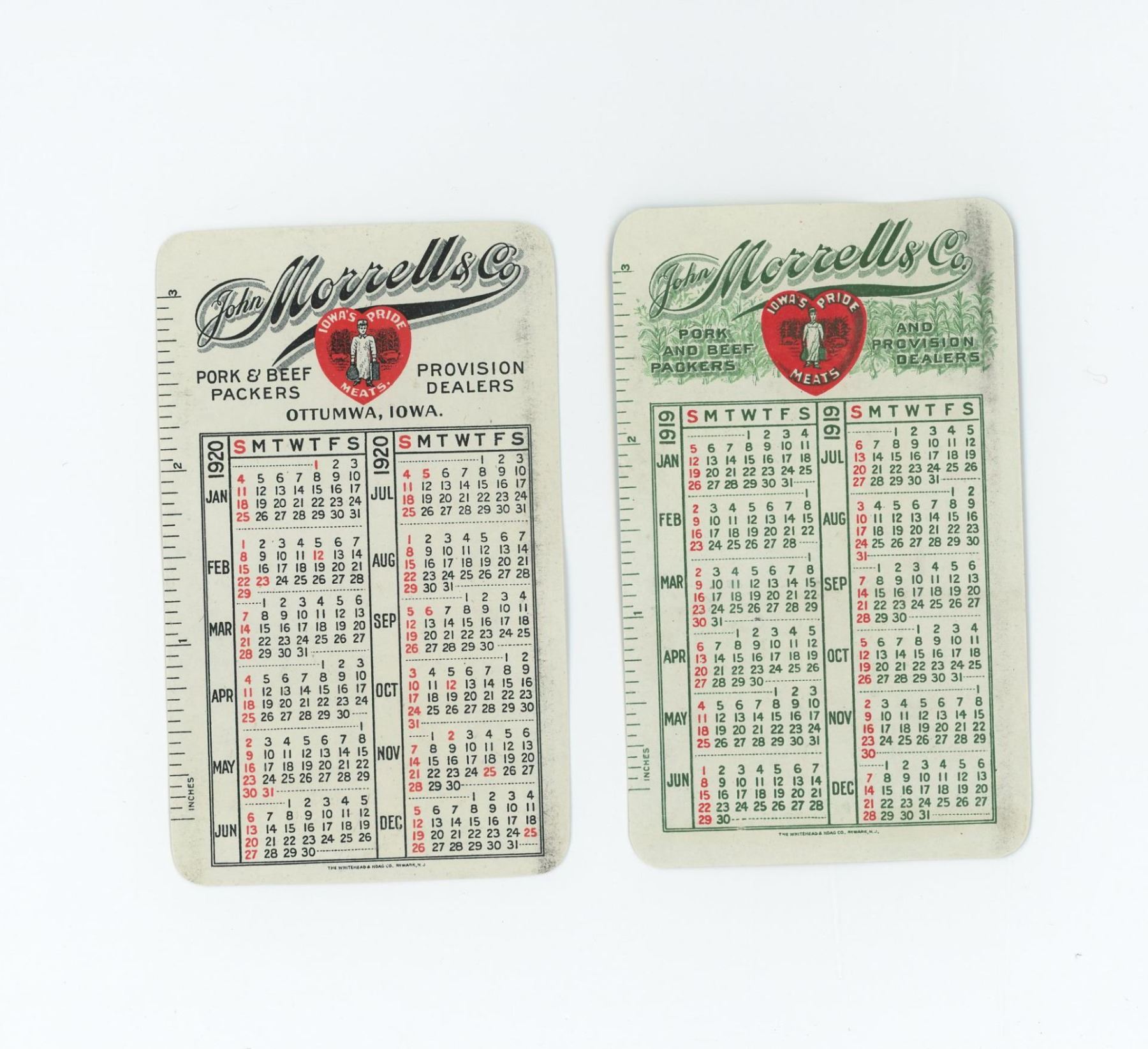 Dated 1919 and 1920. John Morrell & Co. Pork and Beef Packers and Provision Dealers from Ottumwa, Iowa. Each card measures 2 5/8" by 3 3/4".