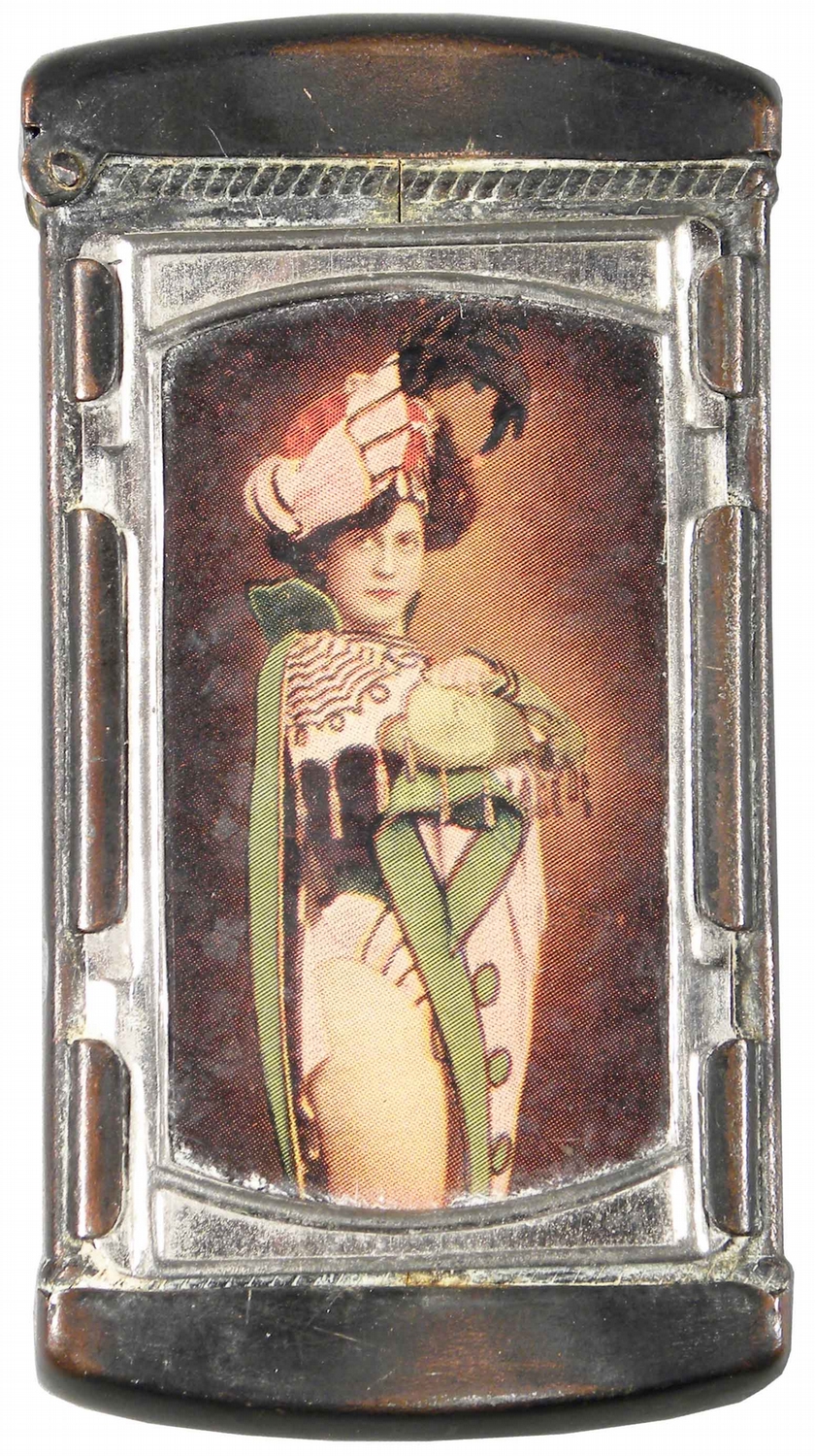 Celluloid Match Safe- Fortune Teller. Call on A.T. Chance Fisher, Minn. Very good condition. 1 1/2 X 2 5/8 inches.