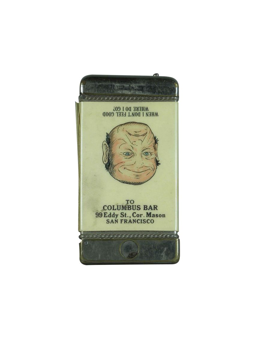 Celluloid Match Safe. Depicting Happy Face/Sad Face. Entitled, "When I don't feel good where do I go?". Advertising the Columbus Bar, San Francisco. Very good condition. 1 1/2 X 2/7/8 X 3/8 inches.