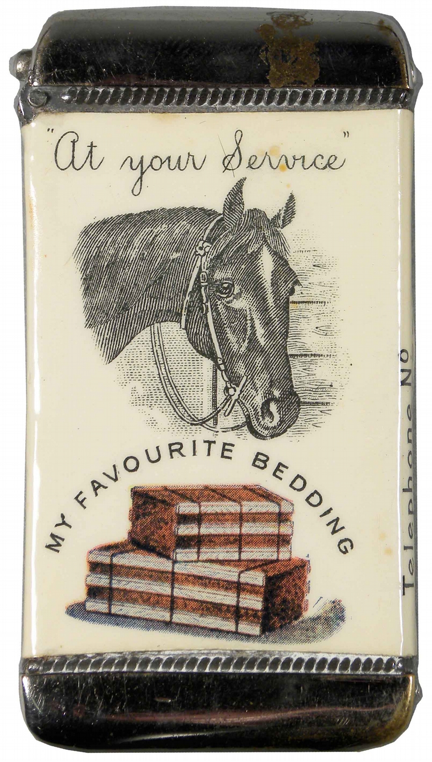 Celluloid Match Safe-Peat Moss Litter Supply Co. Horse/Horse Shoe on front and "At Your Service" w/horse on back. Excellent condition. 1 1/2 X 2 3/4 inches.