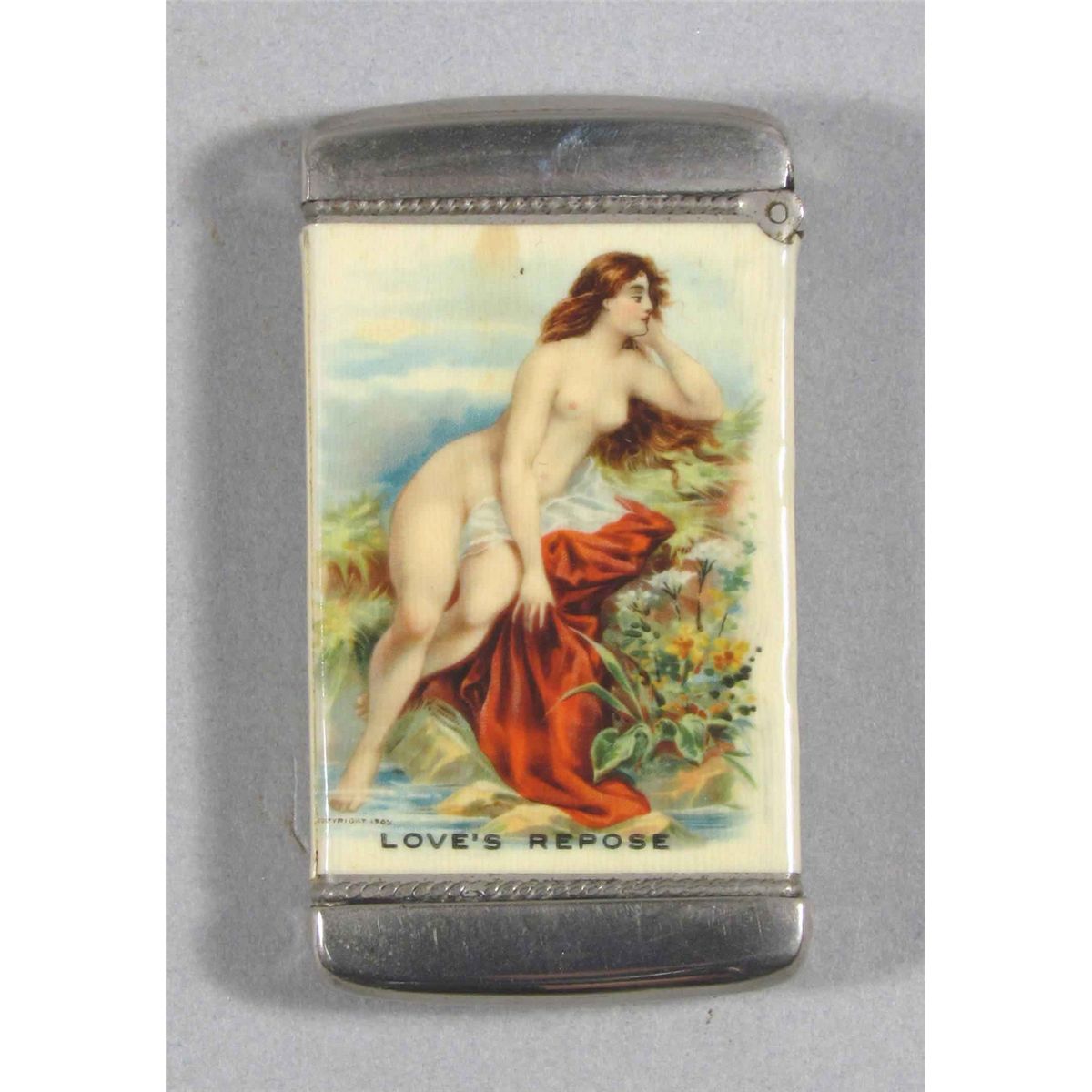 Celluloid Match Safe for Friedman-Shelby Shoe Co. St. Louis. Nude entitled, "Love's Repose". Very slight discoloration at 12:00 otherwise excellent condition. 1 1/2 X 2 3/4 inches. Start Price $100