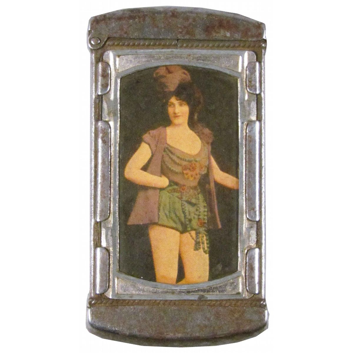 Celluloid Match Safe with Salon Girls. Some wear to nickel otherwise good condition. 1 3/8 X 2 5/8 inches.