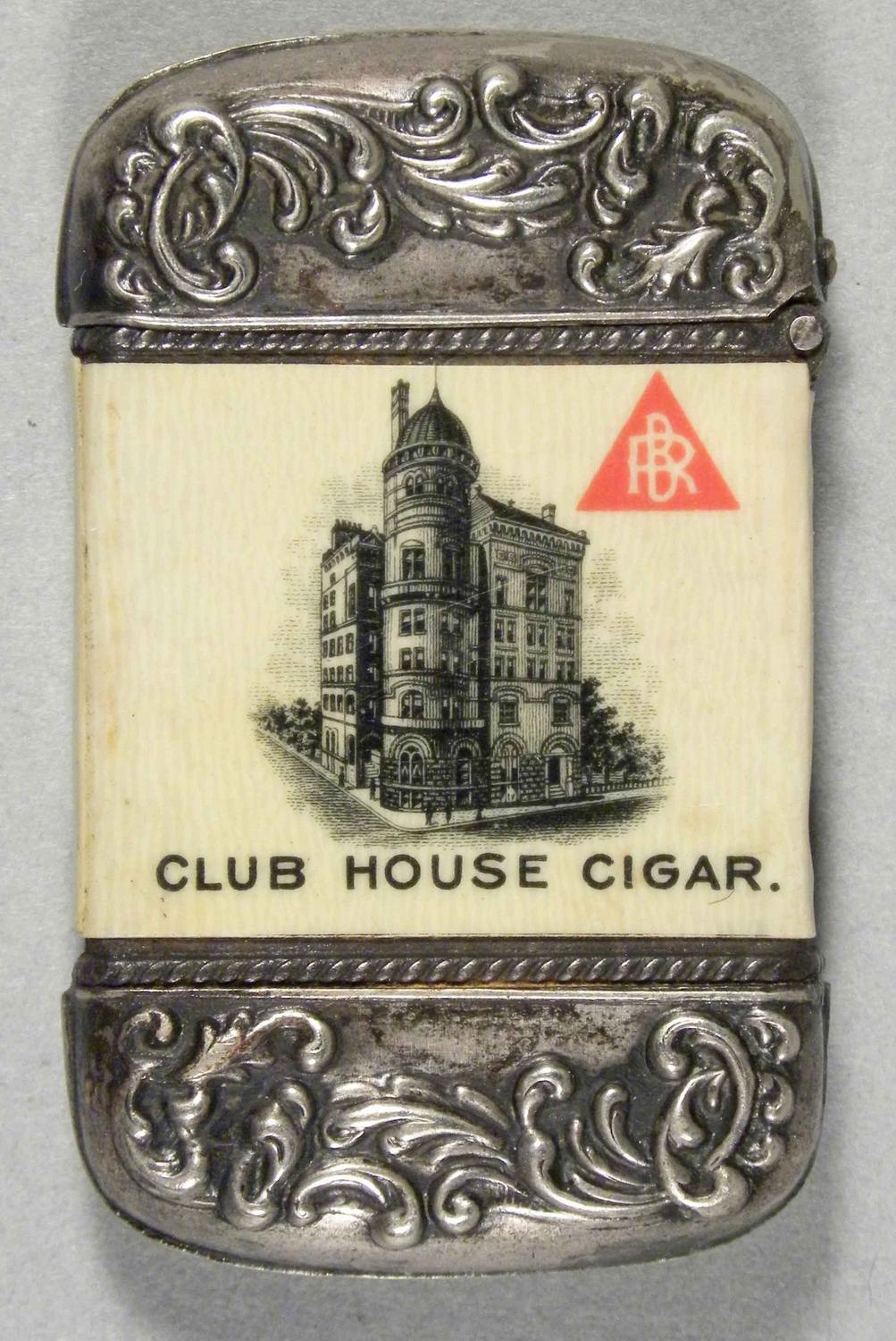 Celluloid Match Safe. Advertising Club House 5 Cent Cigar, Wichita, KS. Back side depicts factory. Excellent condition. 1 3/8 X 2 3/8 inches. Starting bid $70