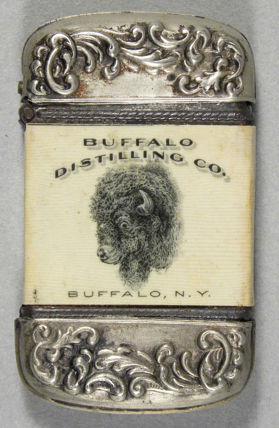 Celluloid Match Safe. Advertising Buffalo Distilling Co. Buffalo, NY. Buffalo head on front and Producers of the Highest Grade Gins and Rye Blends on back. Excellent condition. 1 1/2 X 2 1/2 inches. Starting bid $100