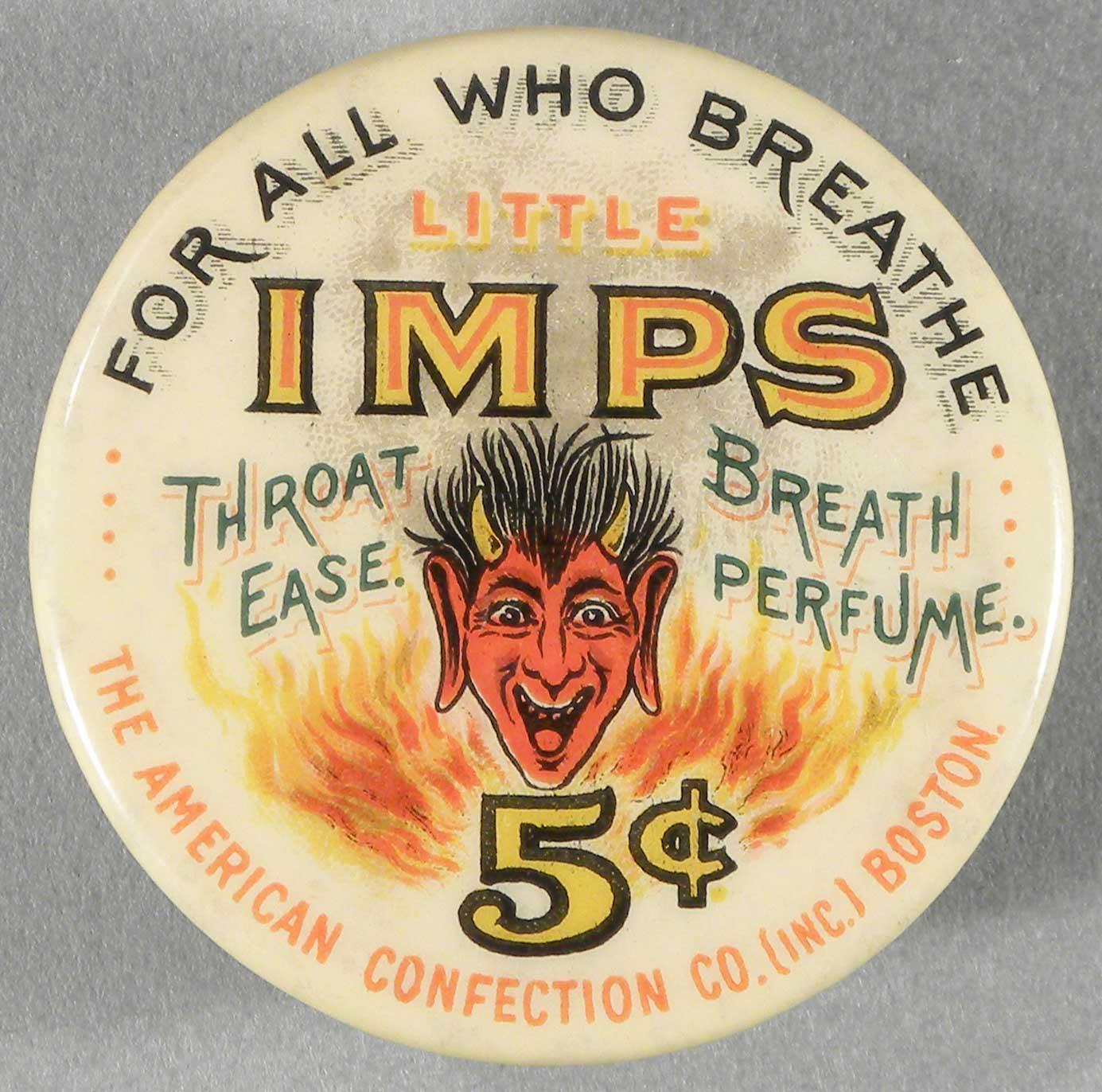 Celluloid Pill Box. "Little Imps". The American Confection Co. Boston. Near mint condition. 1 1/2 inch diameter. Start Price $30