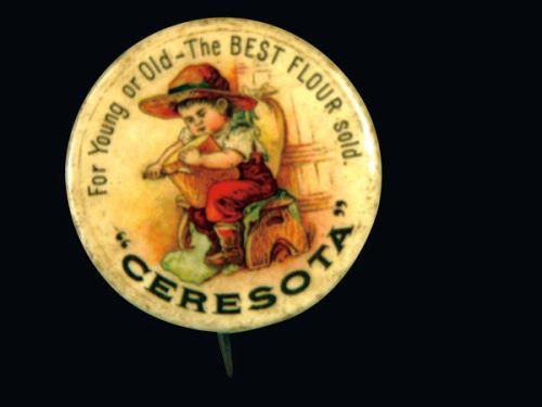 Celluloid Pin back for Ceresota Flour. Excellent condition. 1 1/4 inch dia.