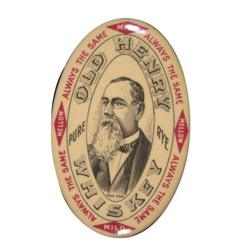 Old Henry Whiskey Celluloid Pocket Mirror. Very good condition. 1 3/4 X 3 inches.