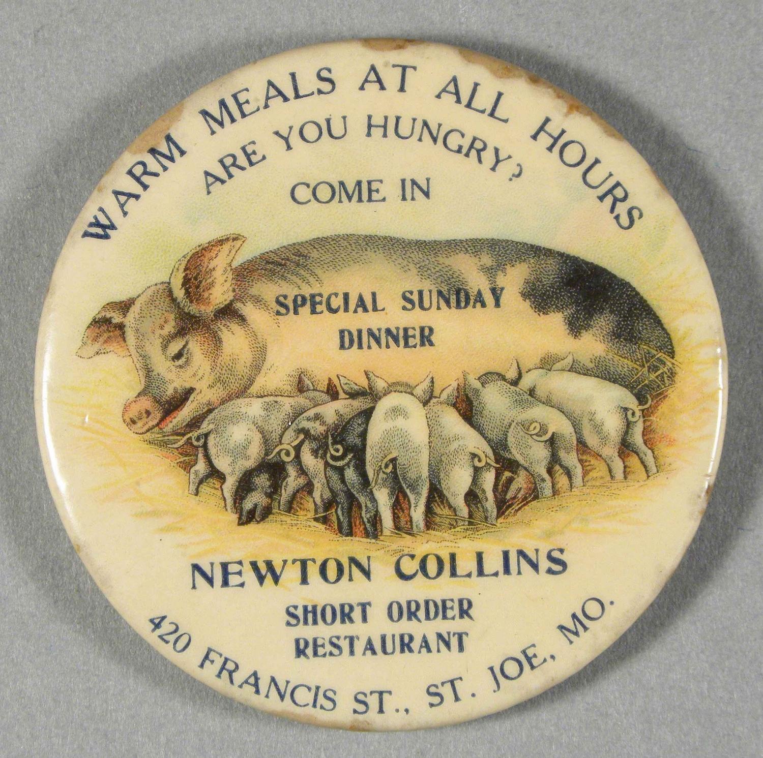 Celluloid Pocket Mirror. Advertising Newton Collins-Short Order Restaurant. St. Joe, MO. Depicting Mama pig feed her young. Minor staining around perimeter otherwise excellent condition. 2 inch diameter. Starting bid $40