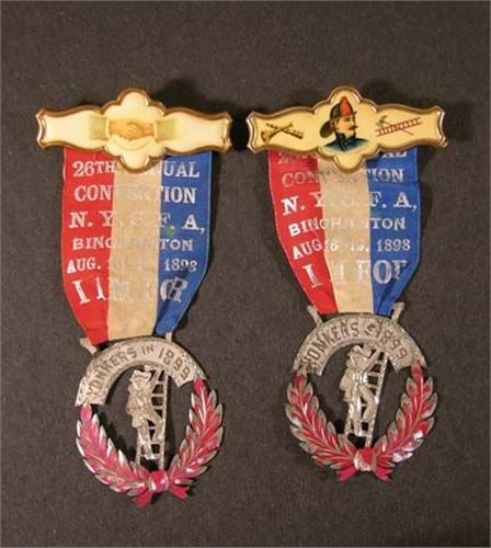 Celluloid ribbon and fire medal, 26th Annual Convention NYSFA Binghamton, NY Aug 19, 1898, 6" long.