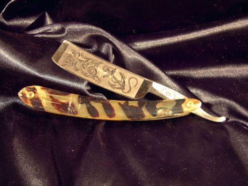 Celluloid Straight Razor with tortoise shell handle. Blade engraved with fancy boat anchor. John Barber. Excellent condition. 6 1/2 inches long.