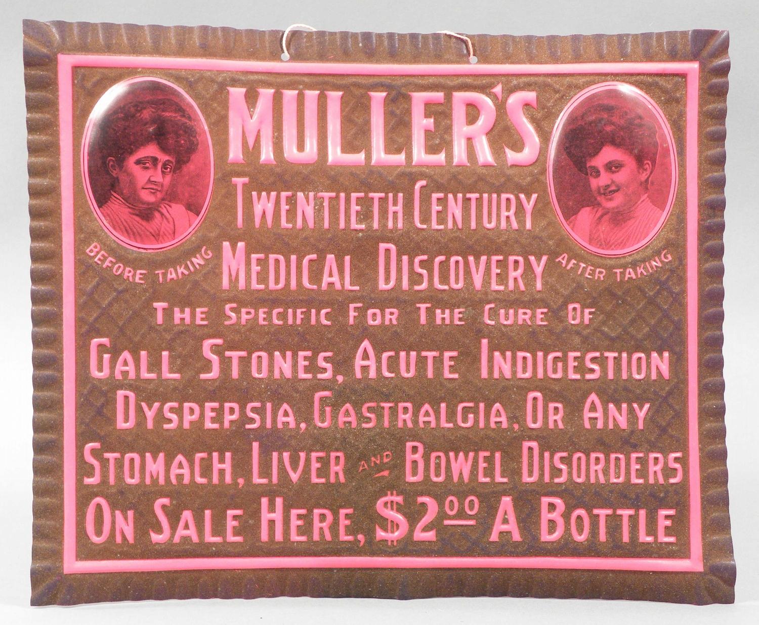 Celluloid String Hanging Sign for Mullers Twentieth Century Medical Discovery. Embossed and self framed. Near mint condition. 11 X 9 inches. Start Price $50