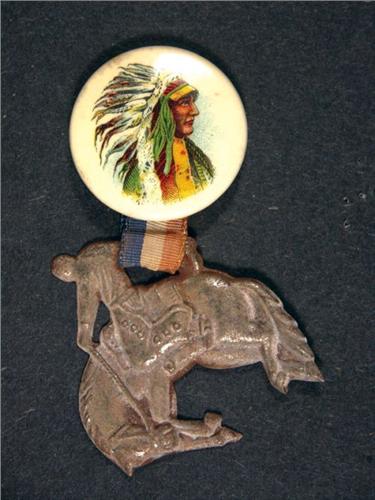 Celluloid/Tin Pin Back depicting Let-Er-Buck and Indian Chief Image. Excellent condition. 3 inches long.
