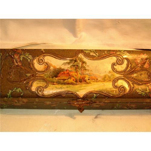 A BEAUTIFUL Victorian celluloid glove or necktie box with a country home portrait on the top surrounded by green and gold mottled background with lavendar poppies. The top is rolling and higher in the back. The entire box is celluloid with 1 very tiny edge chip on the back edge (I did not see it until I felt it with my finger),the celluloid is slightly loose on the edge in a few places as it comes around the box. The hinges and latch are in very good working order. The inside of the box is a blue satin material that has split where the box has been opened in the back. What a GREAT piece to add to your Victorian Celluloid box collection.