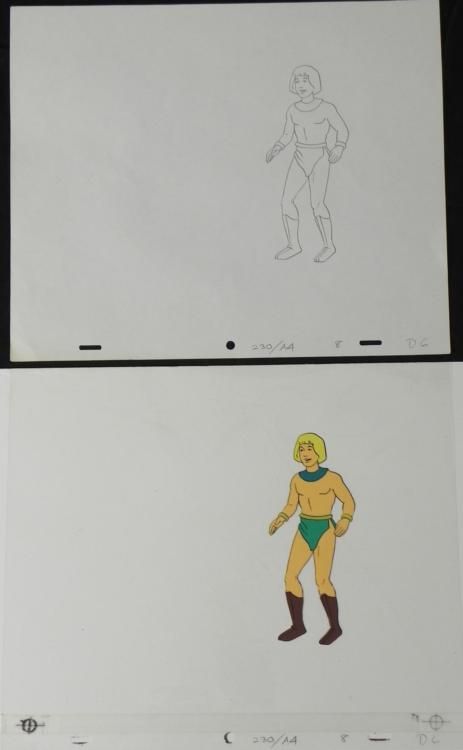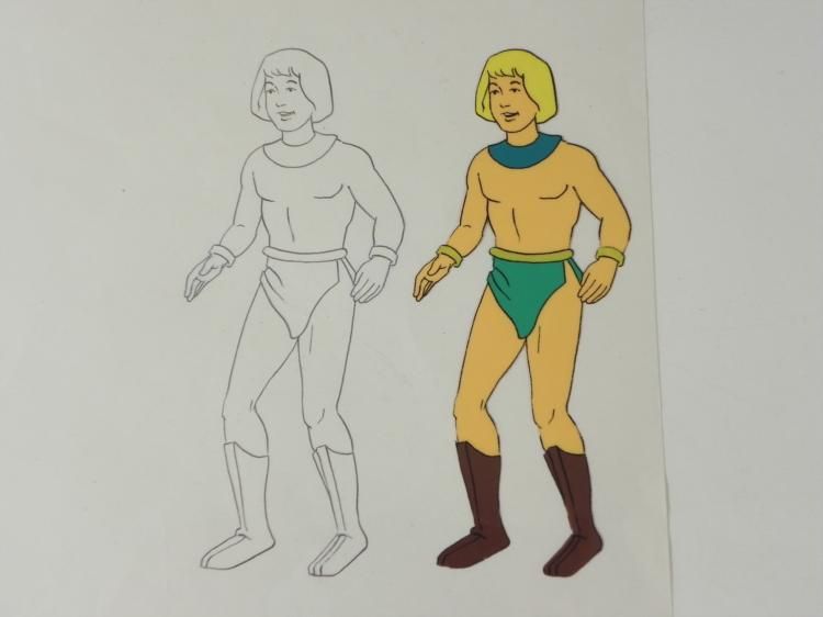 The Herculoids battled to defend their planet from menaces on Amzot/Quasar and from outer space. All of the Herculoids displayed Human-level intelligence - employing precision teamwork and complex tactics - as well as emotions, and Zandor and Tara both displayed a working knowledge of complex alien technologies as well as the ability to pilot interstellar spacecraft-but essentially, Zandor, Tara, Dorno, and the Herculoids were fighting to keep Amzot/Quasar a technology-free, primitive planet. This is frther indicated by the pseudo-barbarian outfits of Zandor, Tara, and Dorno and the fact that technology was used mainly by the various villains, but rarely if ever by the heroes. Although the "speech" of their companions was limited and repetitive, Zandor, Tara and Dorno demonstrated that Gloop and Gleep, at least, had a comprehensive mode of communication, and that they could at least understand and interpret this language. **The cel and drawing are at least 35 years old. OHHHHH, I see, now it makes more sense... Original Animation and Drawing Original "rough" animation drawing, in black and non-photo blue pencil with the notations in black. Overall Size of Drawing: 10 1/2" x 12 1/2" Overall Size of the Cel: 10 1/2" x 12 1/2" Excellent condition This is an original hand-painted cel used in the production of an episode of "Herculoids." Each cel represents a slight change in position of the characters. When individually photographed and projected in rapid succession, the images appear to move. To create production cels, the original animator's drawing is transferred onto an acetate cel (by hand-inking and/or photo copying). The cel is then hand-painted on the reverse side. The drawing and cel are ready to be matted and framed. The notations are located at the bottom of both (taped to the bottom of the cel.