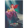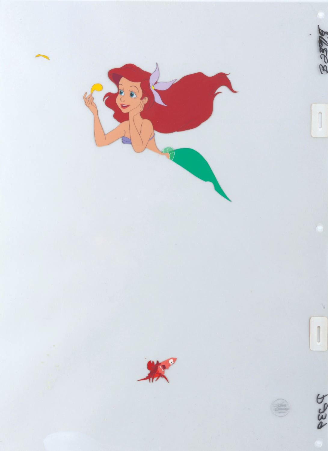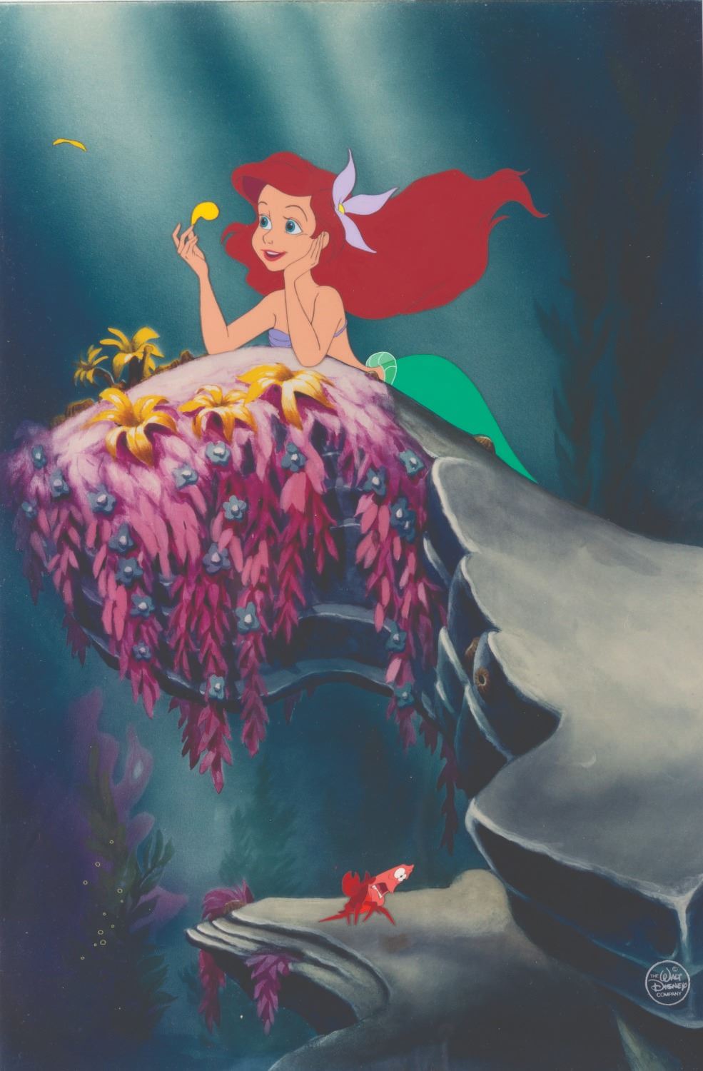 (Disney, 1989) A pair of original production cels of Ariel and Sebastian from Disney's 1989 classic, " The Little Mermaid." Ariel is depicted playing “He loves me, he loves me not” as Sebastian looks on. The cel was prepared for sale by the studio with a premium-quality photographic background to further enhance the piece. This imagery remains so enduring that very similar releases of limited edition art have been recreated over the years to mimic the scene. Ariel has an image size of 6”x5”, while Sebastian measures 1.5”x1”. Both are on untrimmed 12.5"x17" animation cels. The artwork is in very fine condition. An exceptional artifact from the film that launched the Disney Renaissance.