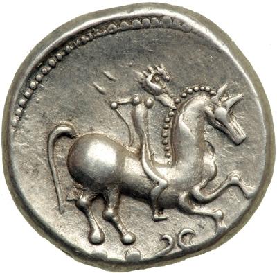 Celtic Coinage, Danubian Region, c. Second Century BC. AR Tetradrachm (13.10 g). Bearded and laureate head right of Zeus. Reverse: Rider on horse prancing right. Cf. Dewing 63; cf. Forrer volume. I, p. 168, 325. Extremely Fine.