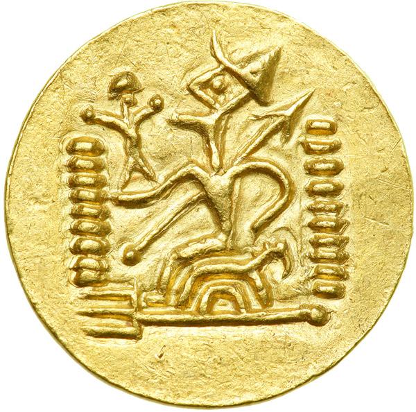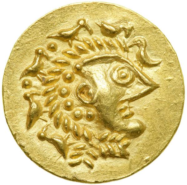 Celtic Coinage. Eastern Europe. Gold Stater (5.69 g, 20 mm). Imitating Lysimachus types. Late 2nd-mid 1st century B.C. Head right, six birds atop hair. Reverse: Enthroned figure left holding smaller figure, spear behind, pseudo-legends in the form of stacked pellets on either side, trident below. Cf. Castelin 1211. E.A. Arslan, Uno statere aureo celto-dacico dal Vercellese, Studia Numismatica Labacensia Alexandro Jelocnik oblata (Ljubliana, 1988), pl. B, II 7.8 var. Superb Extremely Fine.