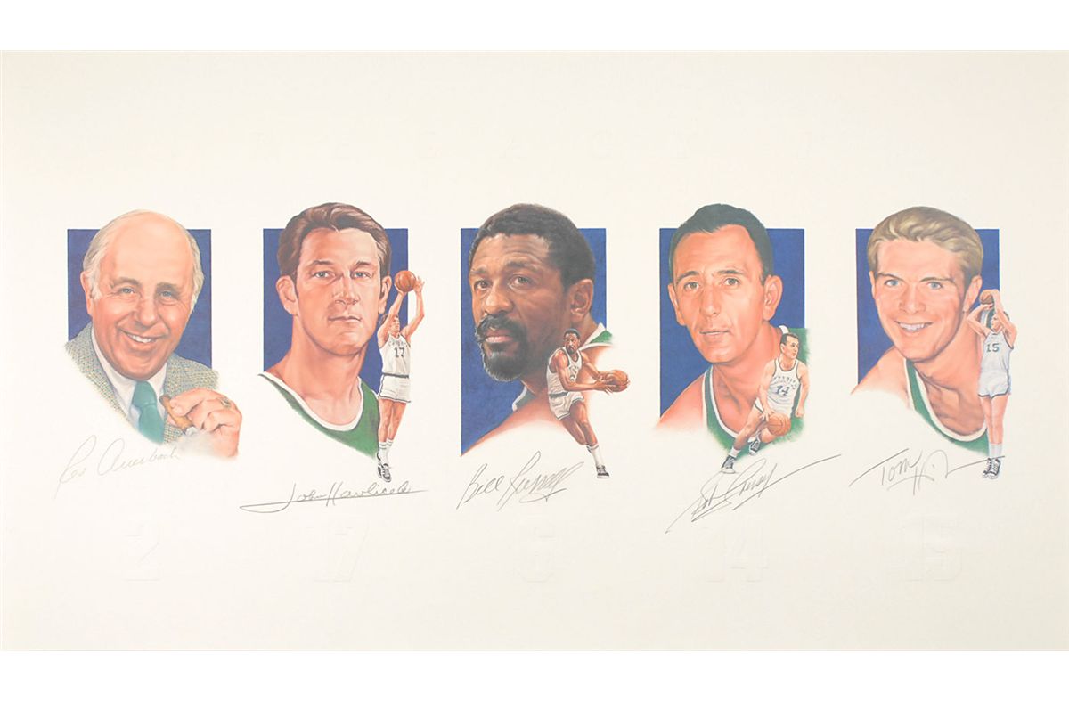 Color 39 x 22.25 lithograph entitled ‘Legacy’, picturing five legendary Celtics, signed in pencil by Red Auerbach, John Havlicek, Bill Russell, Bob Cousy, and Tommy Heinson. In fine condition.