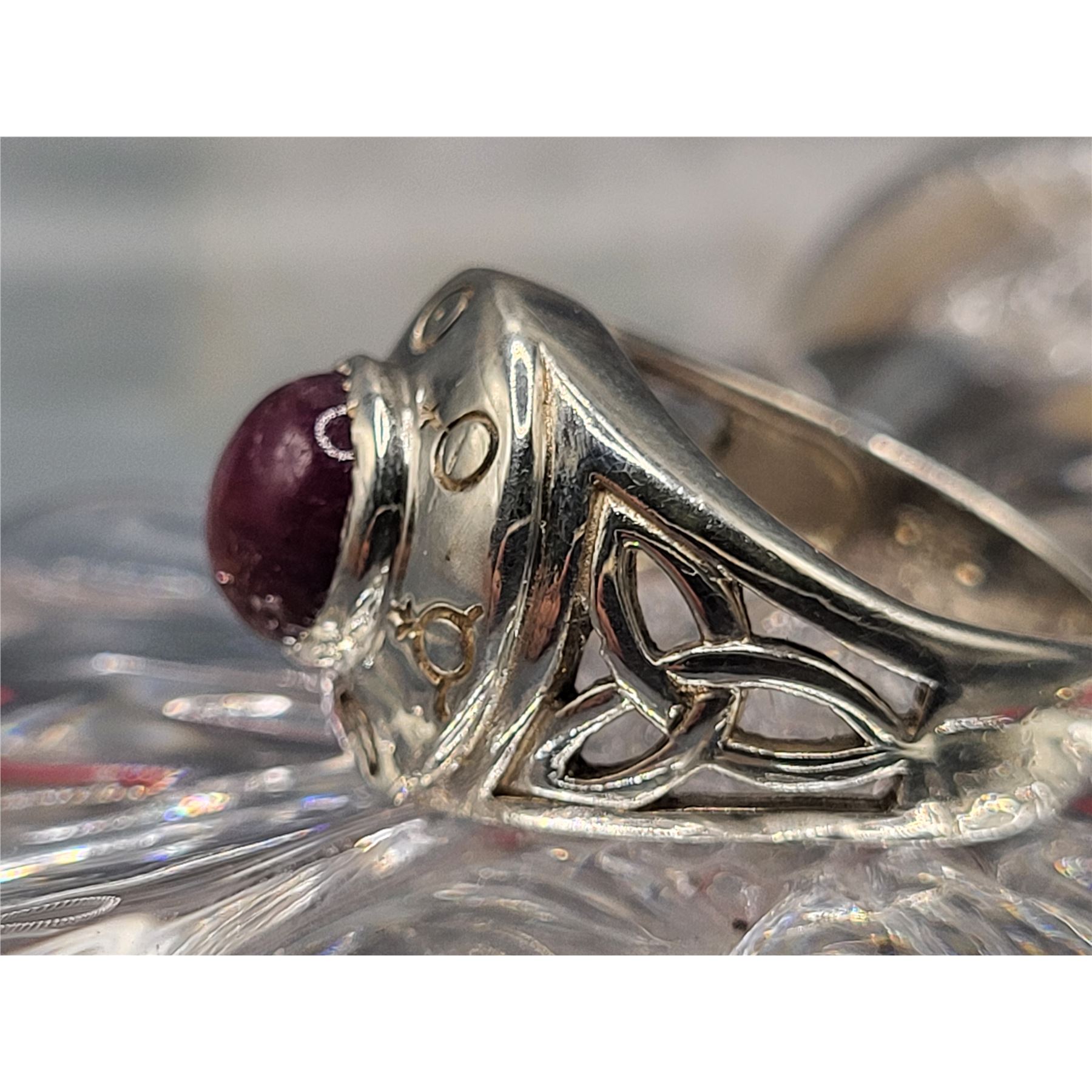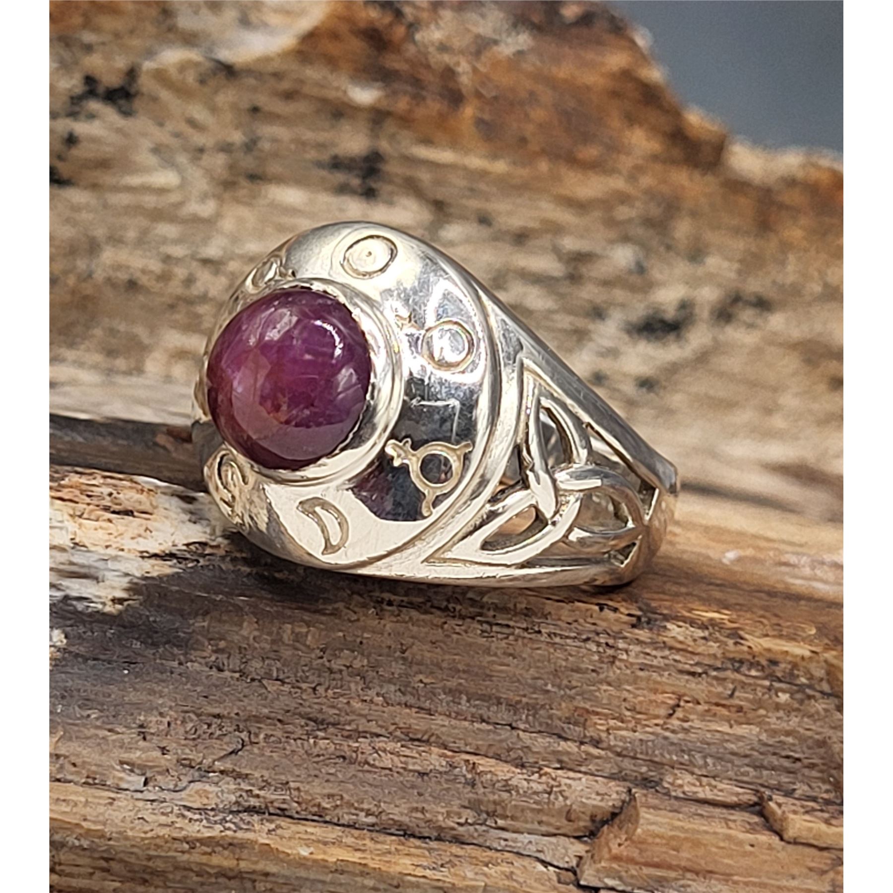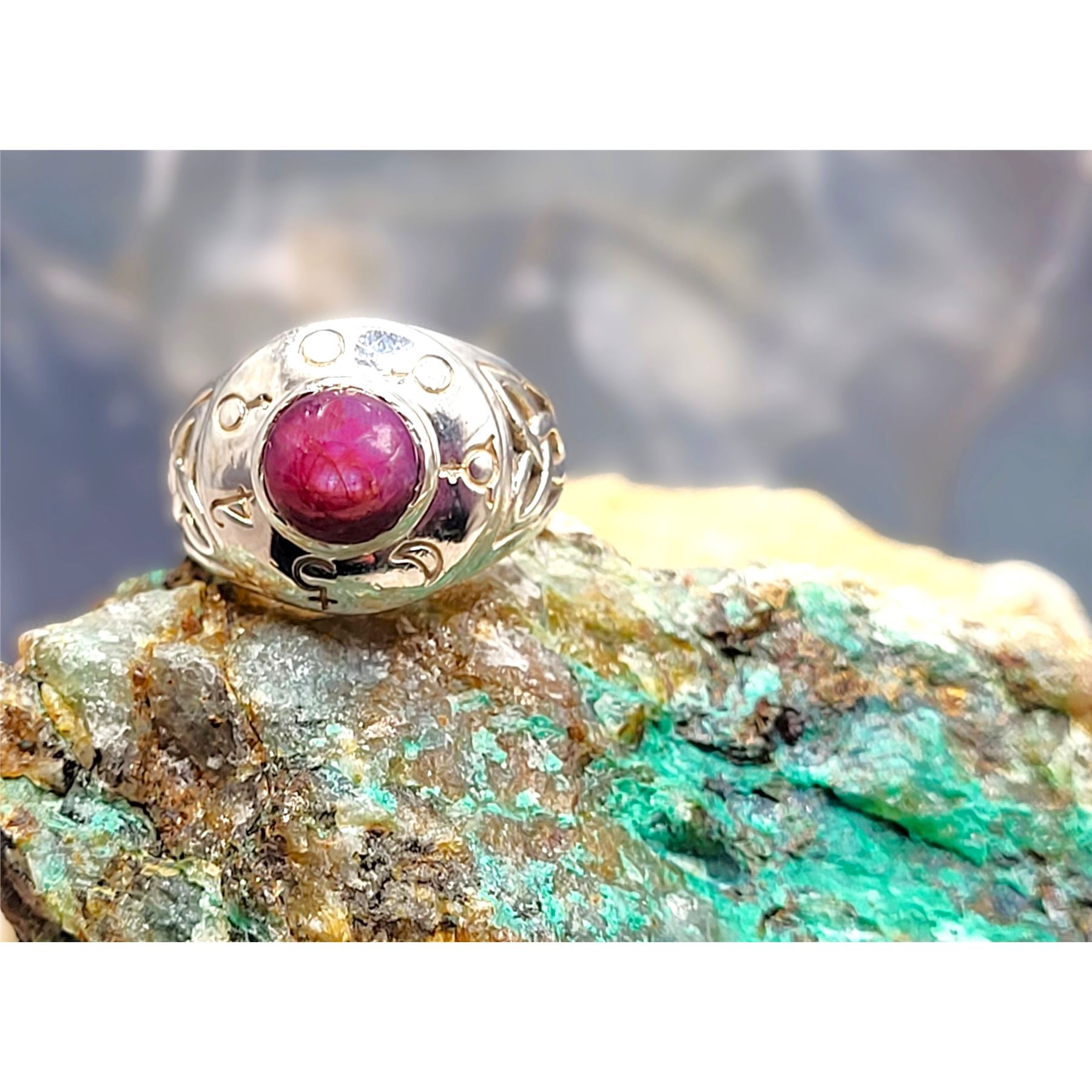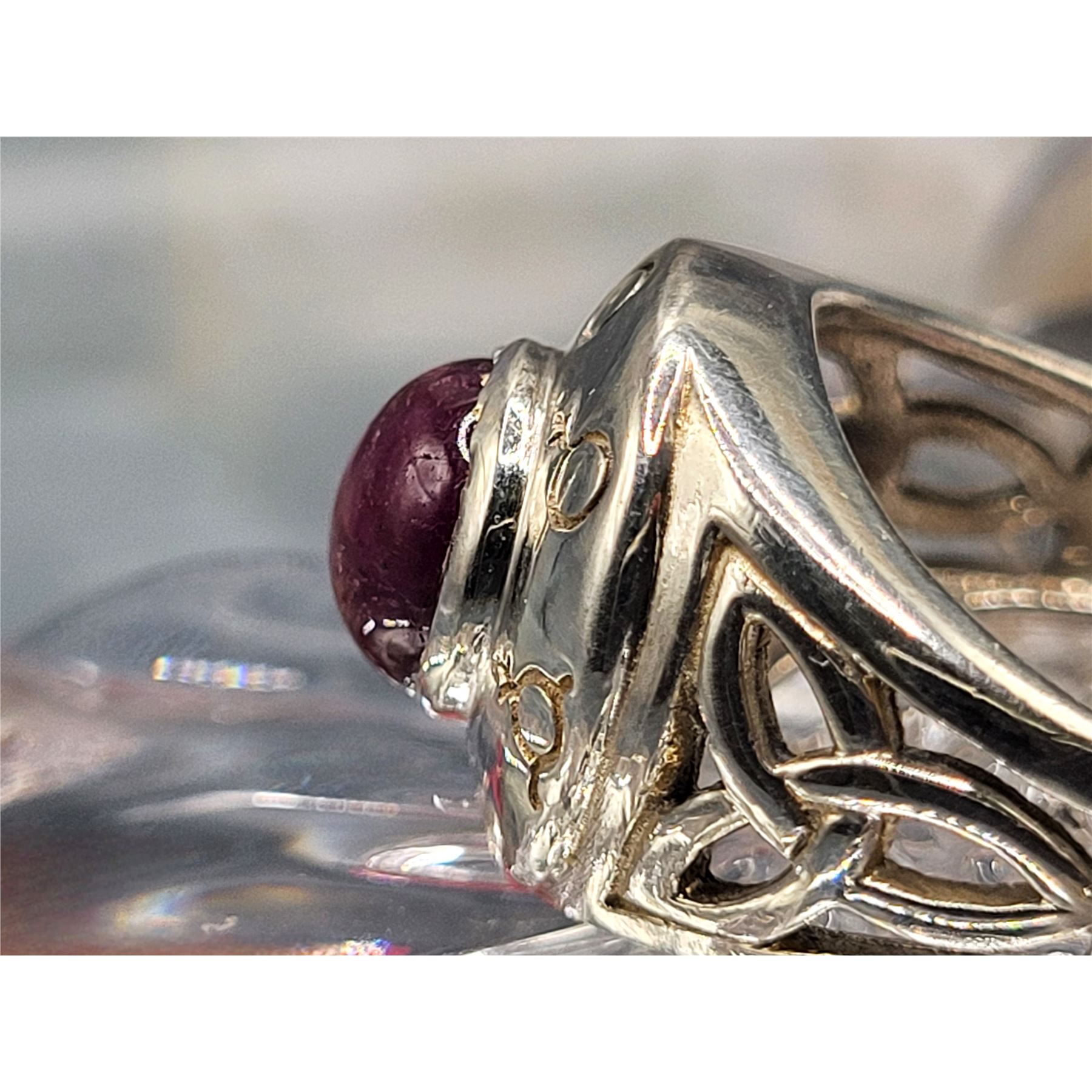 This 6g .925 sterlingsilver ring features a bezel-set round cabochon star ruby (6–6.5mm) glowing with deep red mystery. The Celtic-inspired openwork domed ring is engraved with celestial and symbolic motifs, creating a piece that blends heritage, mysticism, and modern intention. A one-of-a-kind creation, reimagined to shine anew. See sizing details and other information below. AdminCode:K1821225/brr
