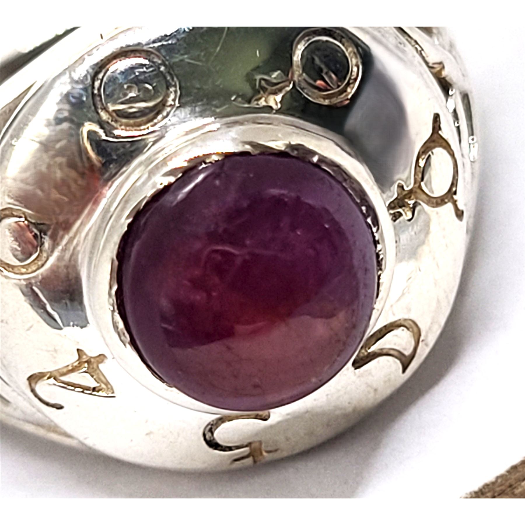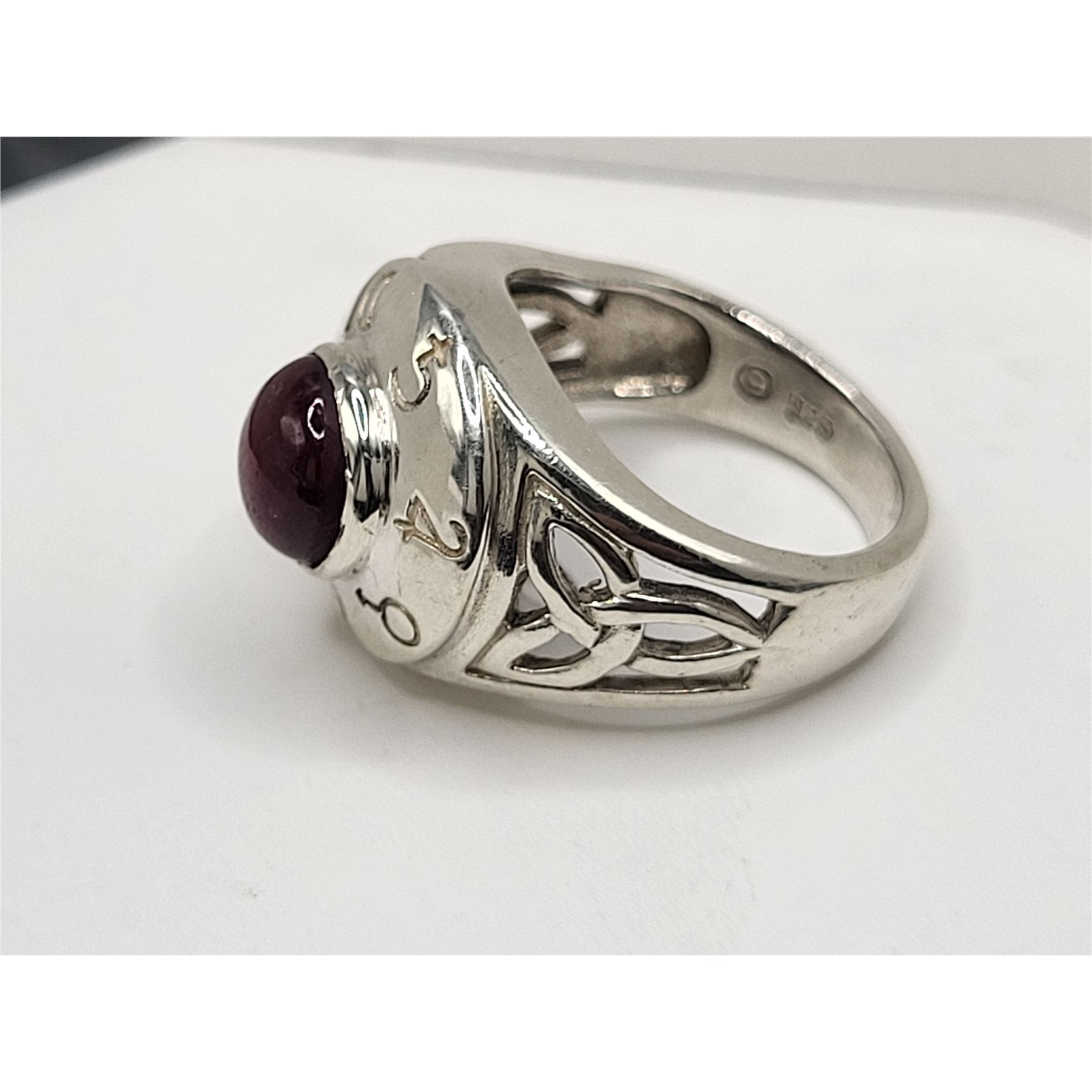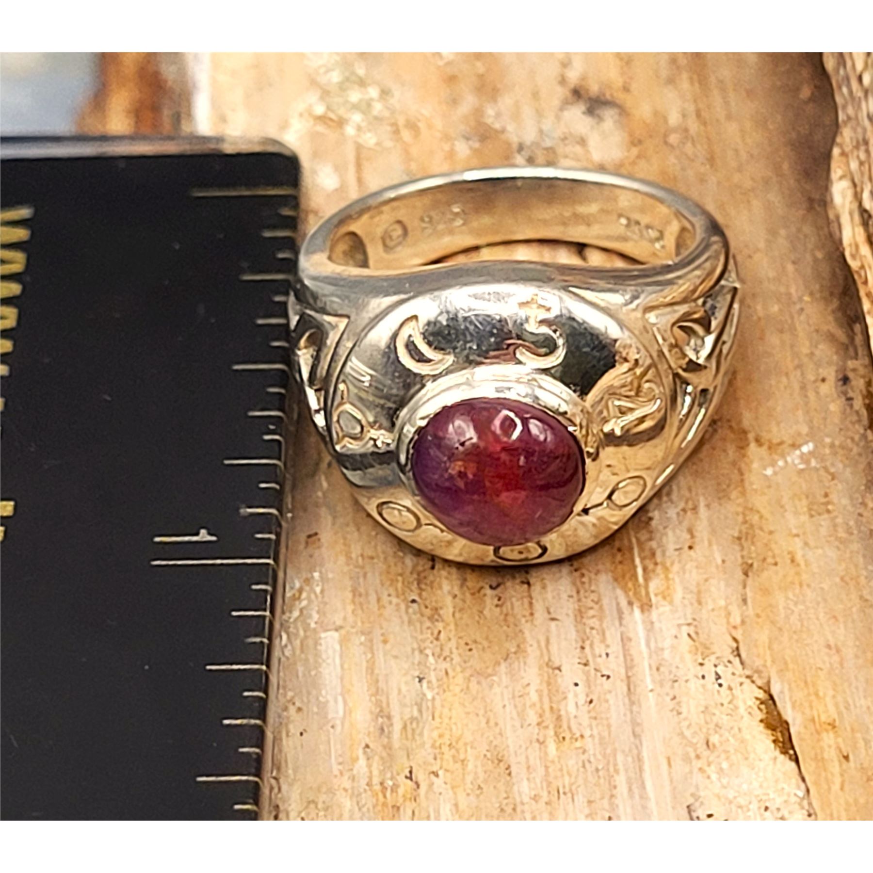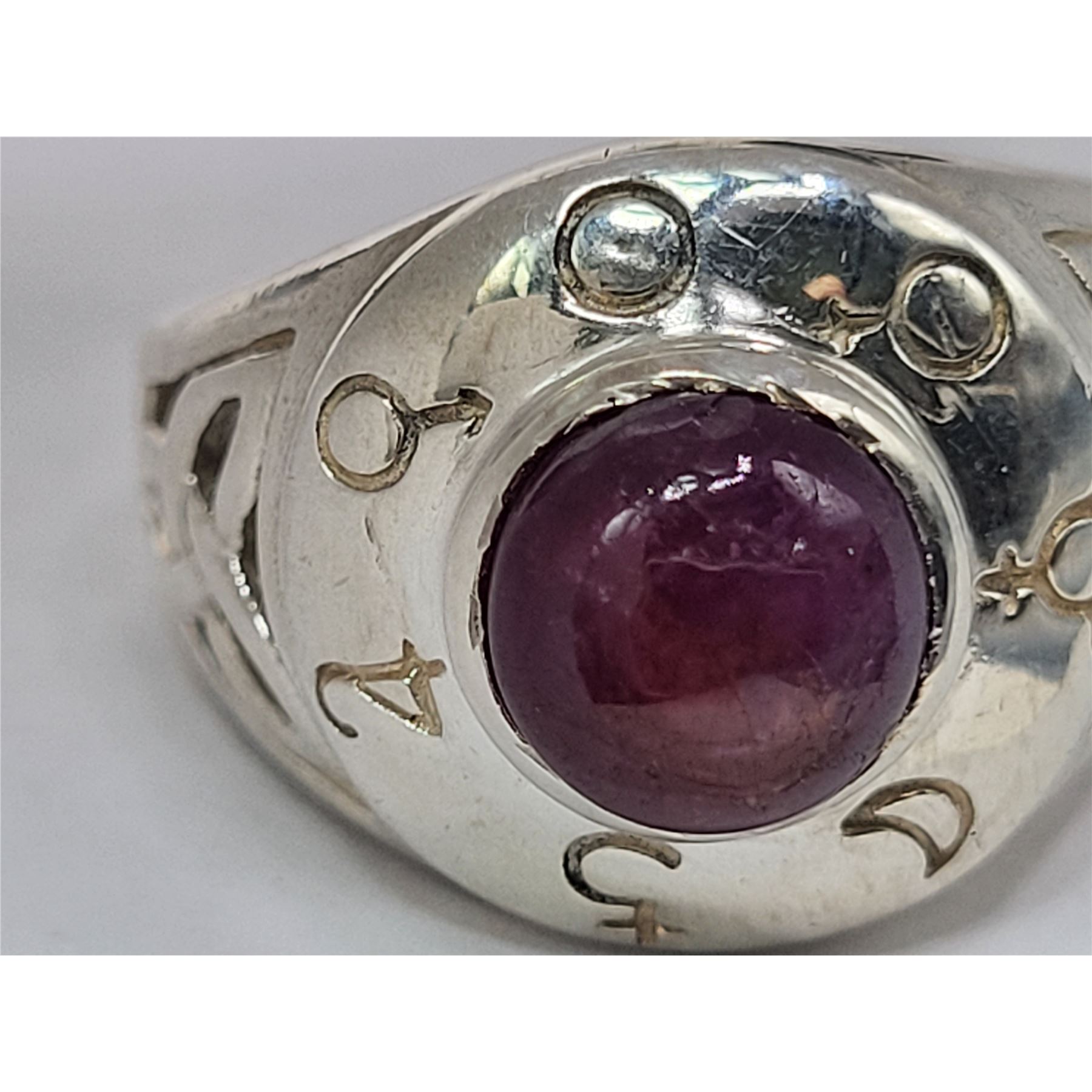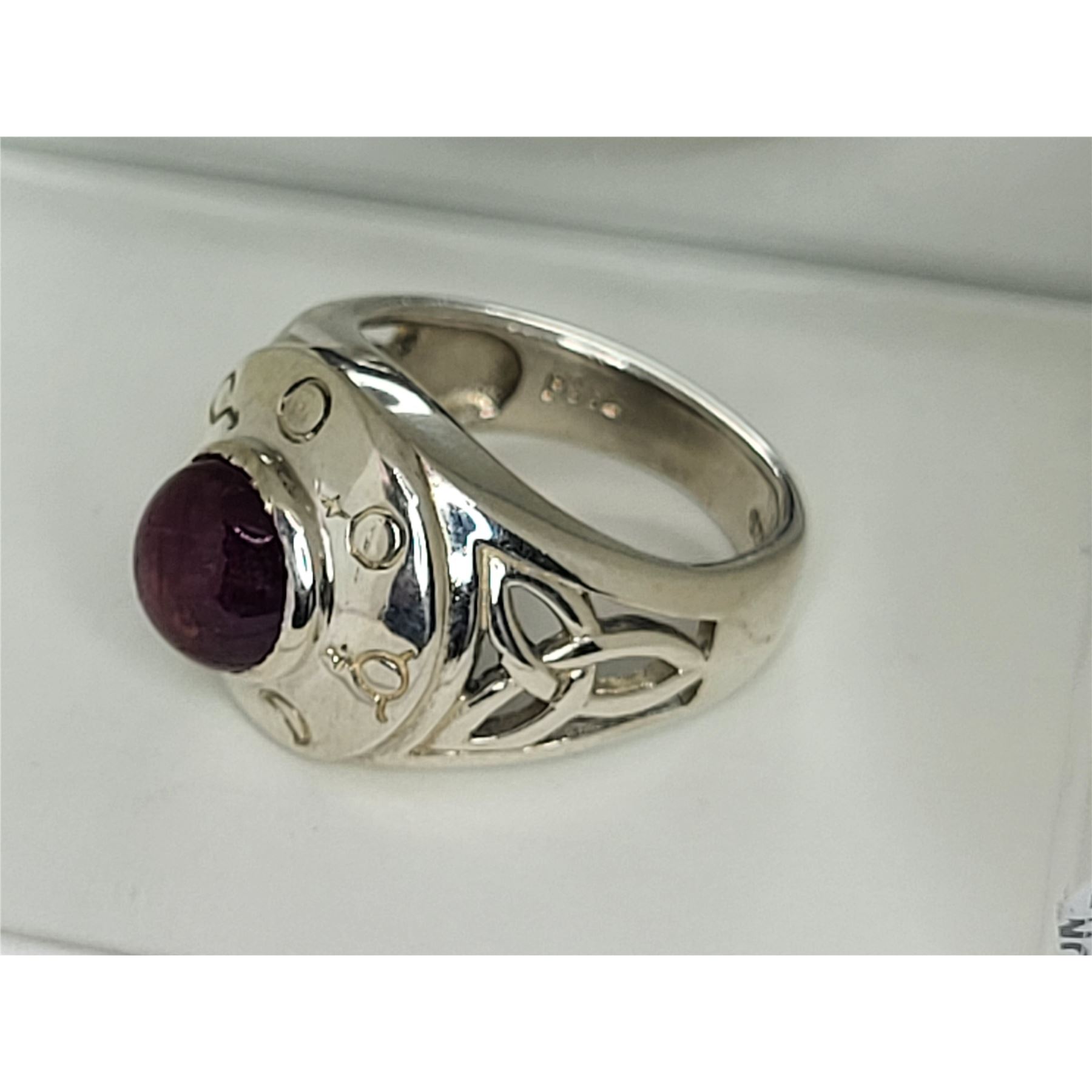 This 6g .925 sterlingsilver ring features a bezel-set round cabochon star ruby (6–6.5mm) glowing with deep red mystery. The Celtic-inspired openwork domed ring is engraved with celestial and symbolic motifs, creating a piece that blends heritage, mysticism, and modern intention. A one-of-a-kind creation, reimagined to shine anew. See sizing details and other information below. AdminCode:K1821225/brr