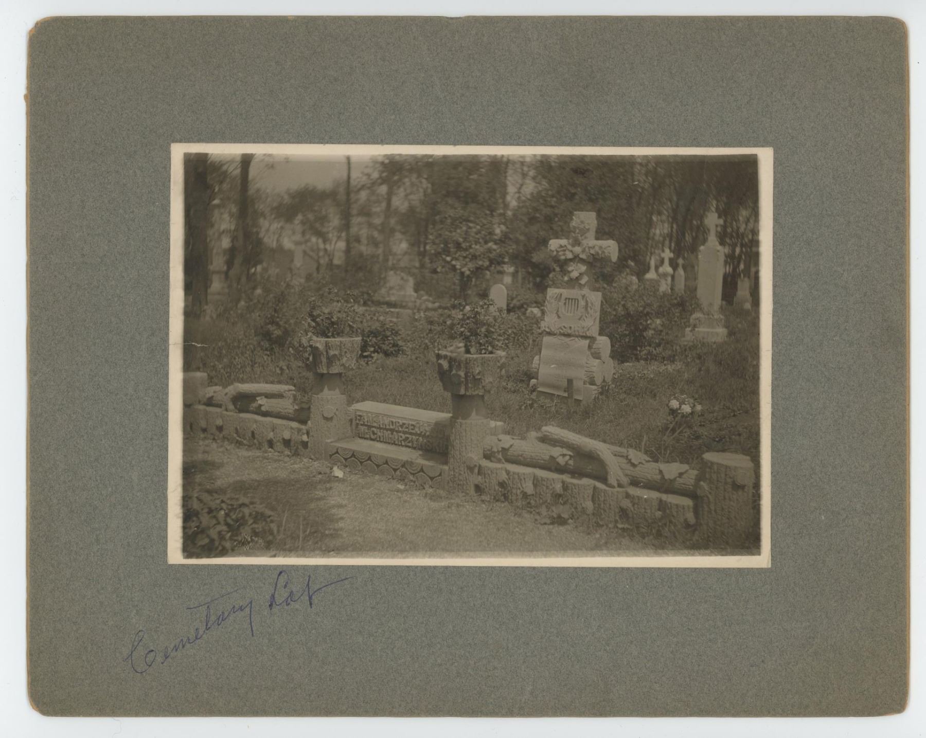 8" 10". The last name on the bottom appears to read Mr. Chmarzynski, while the top name is not quite legible. The monument style especially the carved fallen tree with cut branches is characteristic of Woodmen of the World memorials, commonly used in the United States roughly 1890–1920, particularly among immigrant communities, including Polish Americans.