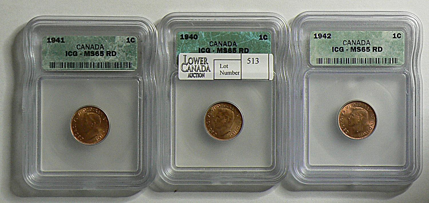 Cent 1940, 1941 & 1942, all graded ICG MS-65; Red. Lot of 3 coins.