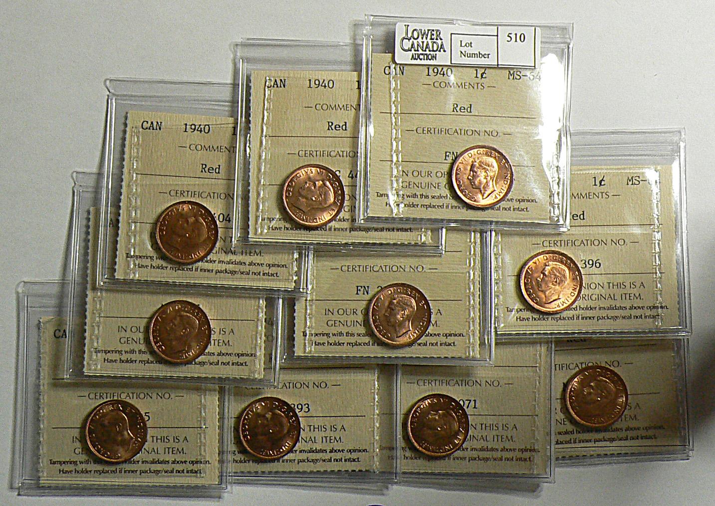 Cent 1940, graded ICCS MS-64; Red. Lot of 10 coins.