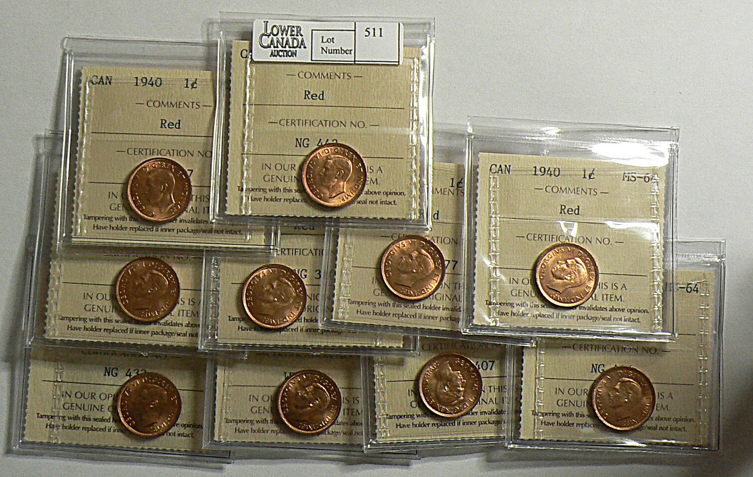 Cent 1940, graded ICCS MS-64; Red. Lot of 10 coins.