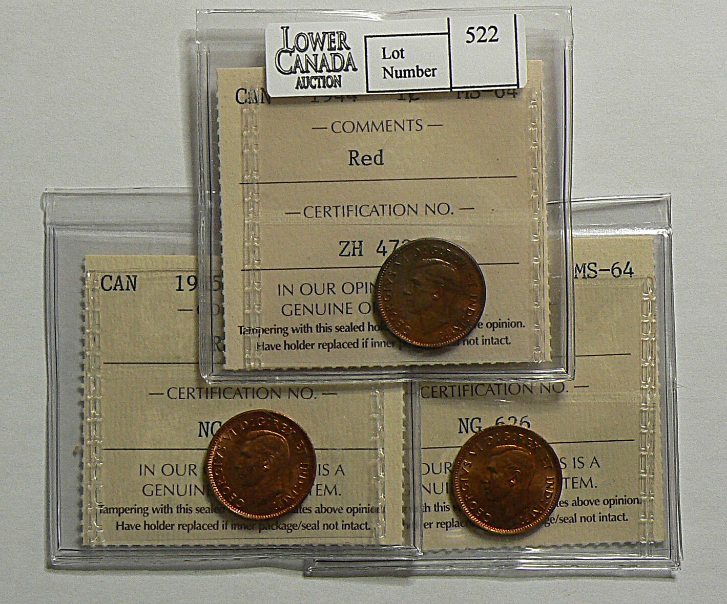 Cent 1944, 1945 & 1946, all graded ICCS MS-64; Red. Lot of 3 coins.