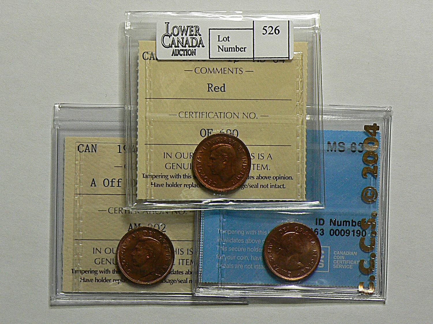 Cent 1946, graded CCCS MS-64, Red, 1948, graded ICCS MS-63, A off denticles, Red, 1957, graded CCCS