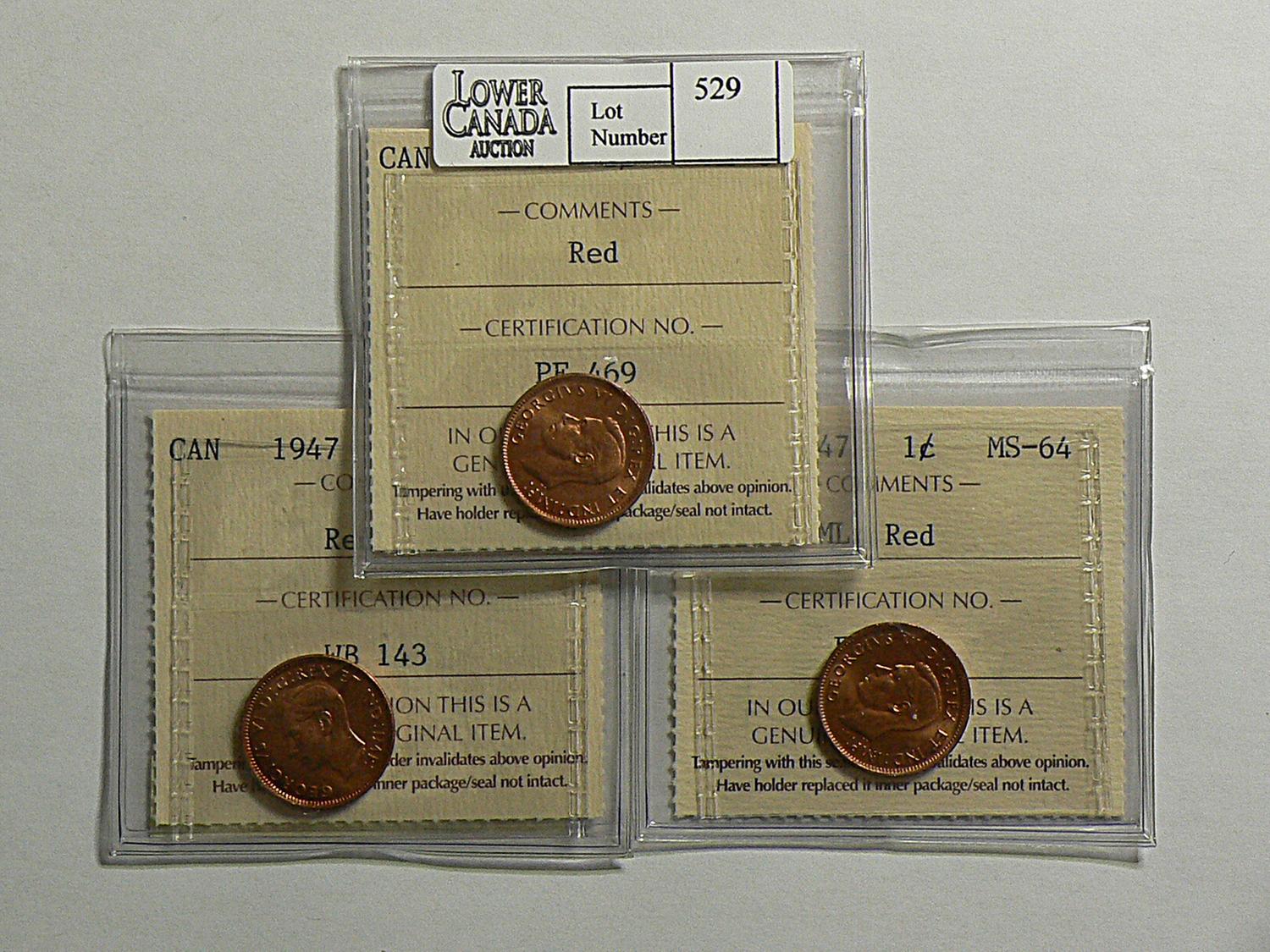Cent 1947, graded ICCS MS-64; Red, 1947, graded ICCS MS-65; Red & 1947, graded ICCS MS-64; Red, Maple Leaf (Pointed). Lot of 3 coins.