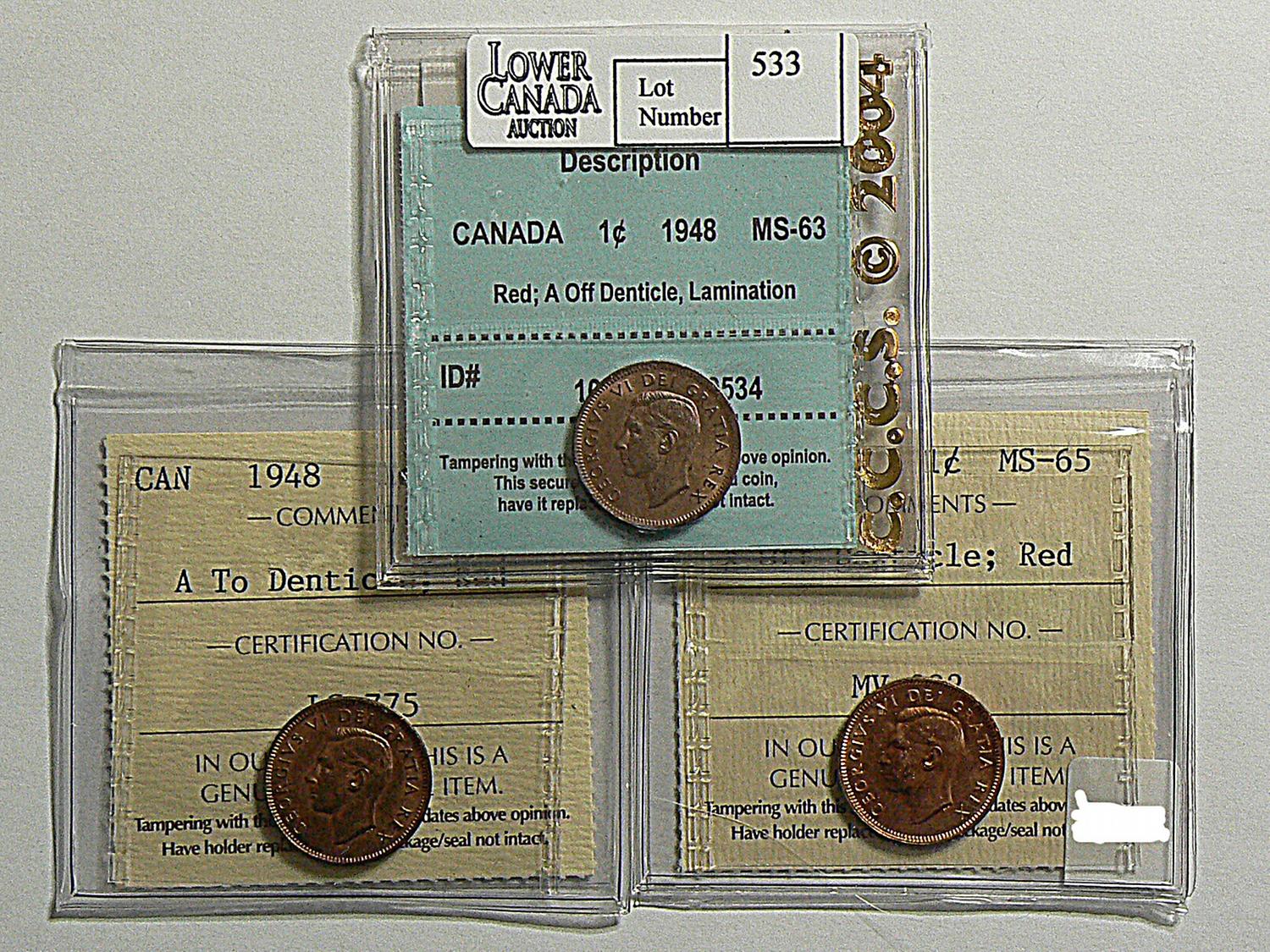 Cent 1948 CCCS MS-63; Red, A Off Denticle, Lamination, 1948 ICCS MS-63; Red, A To Denticle & 1949 IC