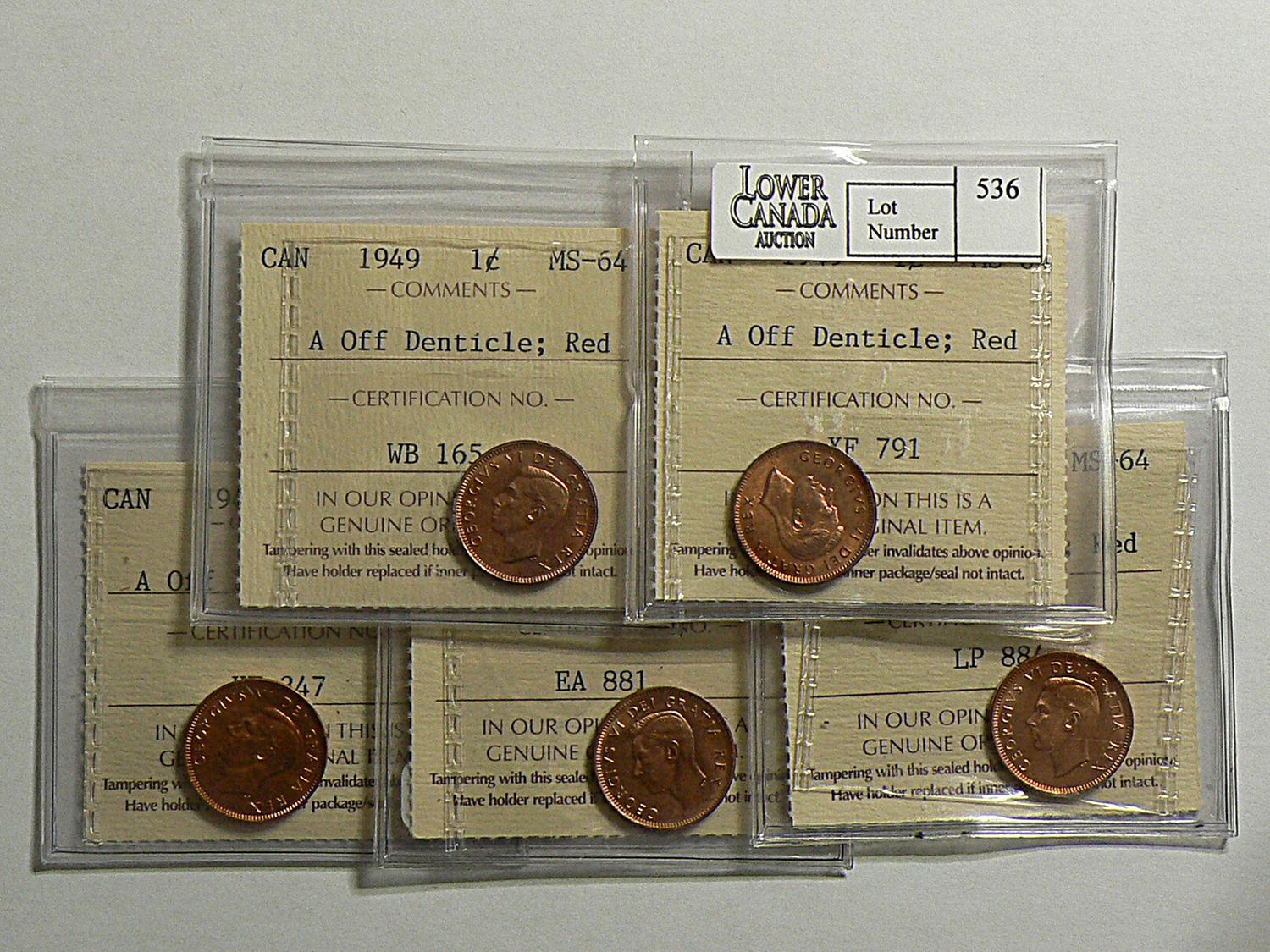 Cent 1949, graded ICCS MS-64; Red, A Off Denticle. Lot of 5 coins.