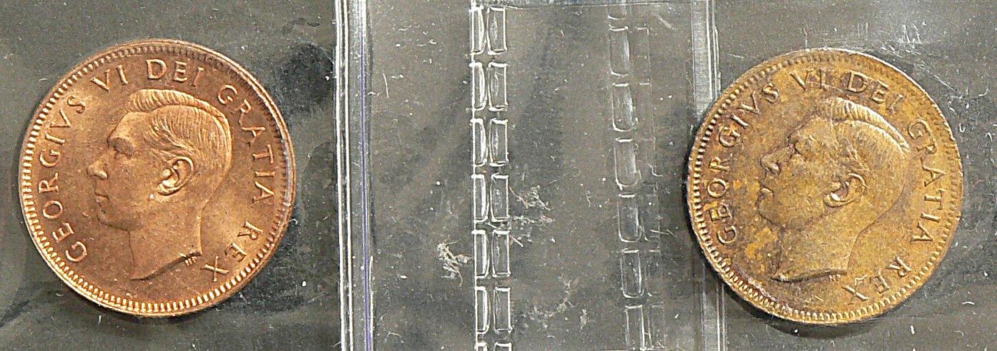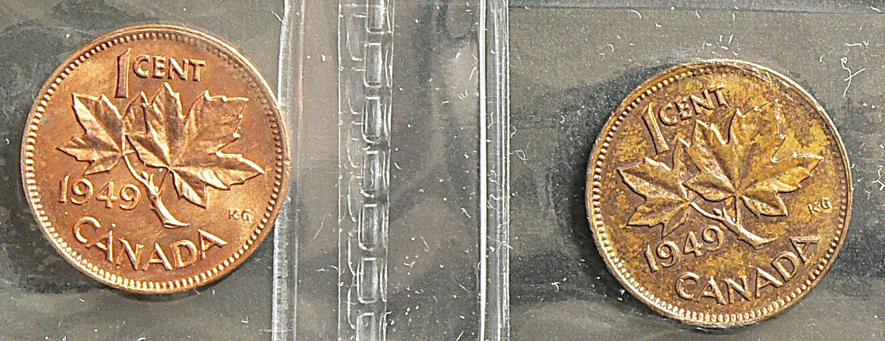 Cent 1949, graded ICCS MS-65; Red, A Off Denticle & 1949, graded ICCS AU-55; A To Denticle. Lot of 2 coins.