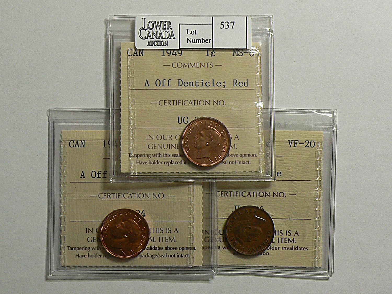 Cent 1949, graded ICCS MS-65; Red, A Off Denticle x 2 & 1949, graded ICCS VF-20; A To Denticle. Lot of 3 coins.