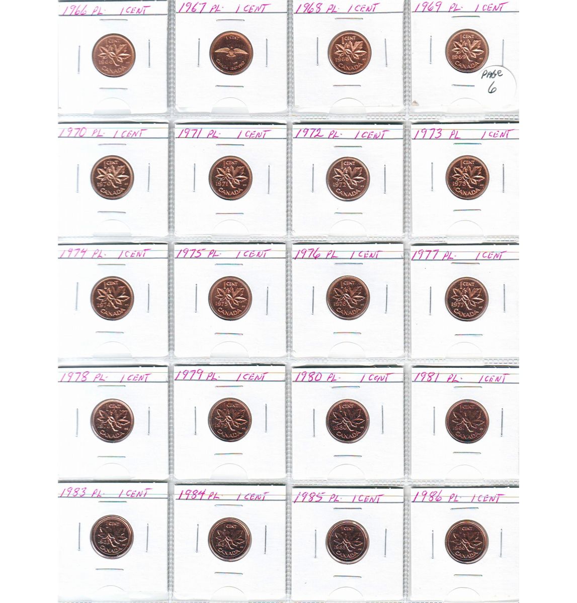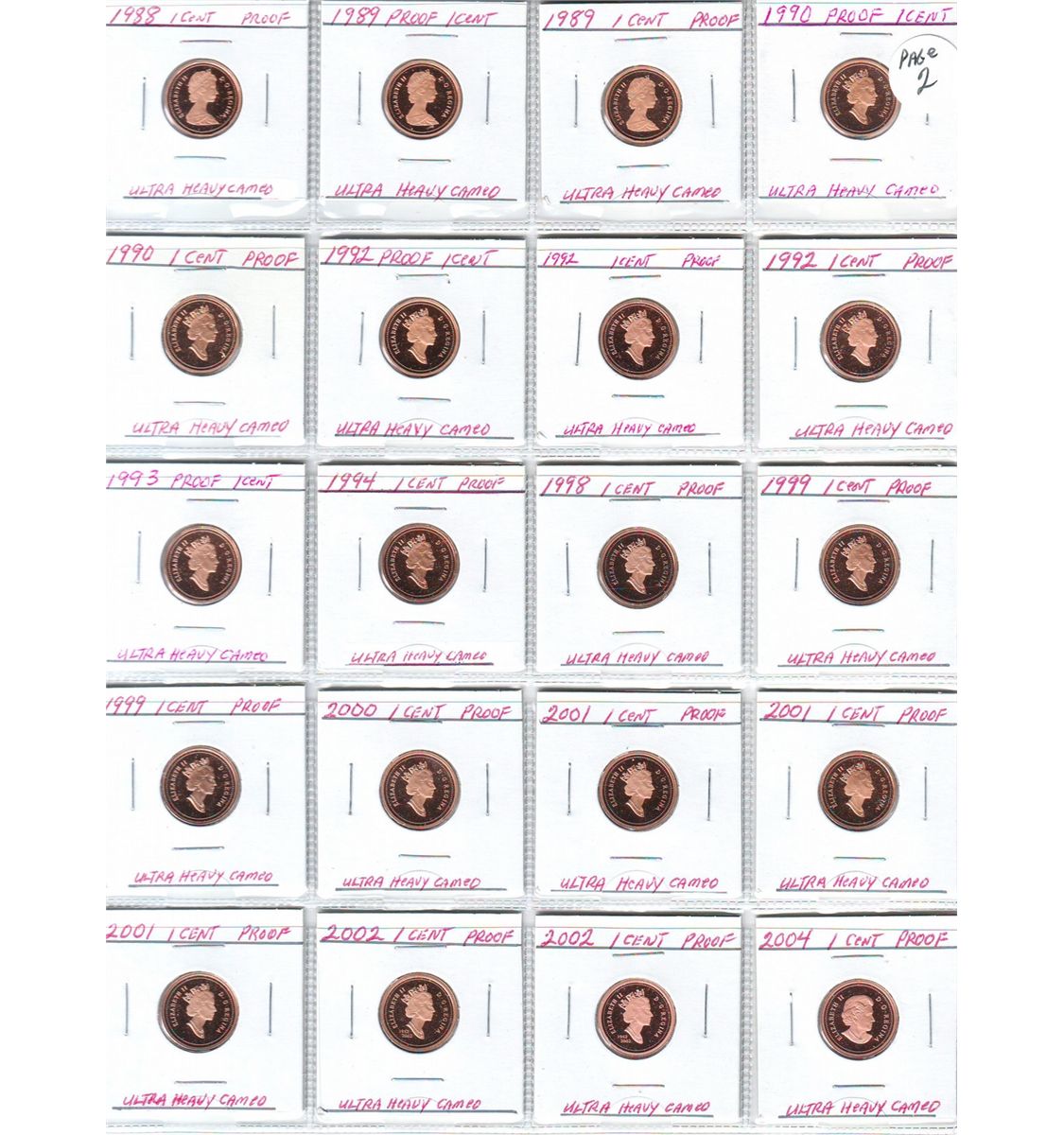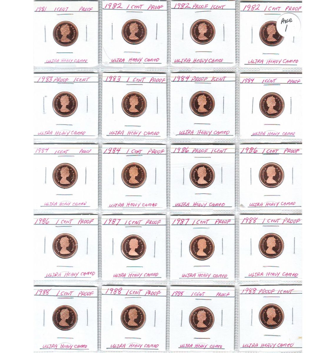Cent 1981 to 2004 Proof with Ultra Heavy Cameo strikes, 40 coins with duplicate dates. 1966 to 1986 Proof-Like issues, 20 coins. Lot of 60 coins.
