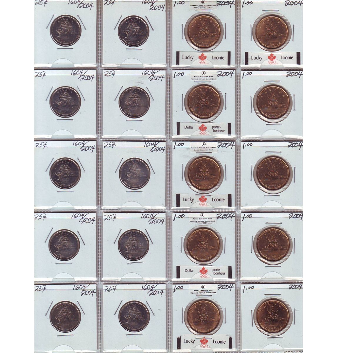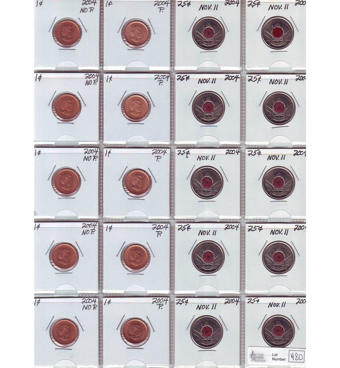 Cent 2004 x 5, cent 2004P x 5, 25 cents 2004P Red Poppy x 10, 25 cents 1604-2002P First Settlement x 10 and 1 dollar 2004 Olympic Loon x 10 all BU in 2x2 in pages. Lot of 40 coins with a face value of $15,10.