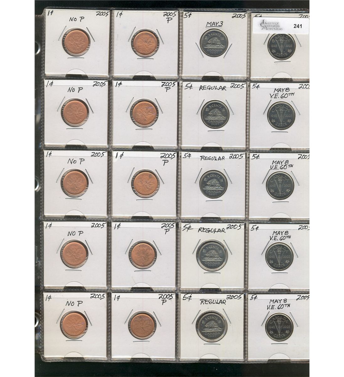 Cent 2005 x 5, cent 2005P x 5, 5 cents 2005P Beaver x 5, 5 cents 2005P VE Day x 5, 10 cents 2005P x 5, 25 cents 2005P Caribou x 5, 25 cents 2005P Alberta 100th x 10, 25 cents 2005P Saskatchewan 100th x 5, 25 cents 2005P Veterans x 5, 1 dollar 2005 Loon x