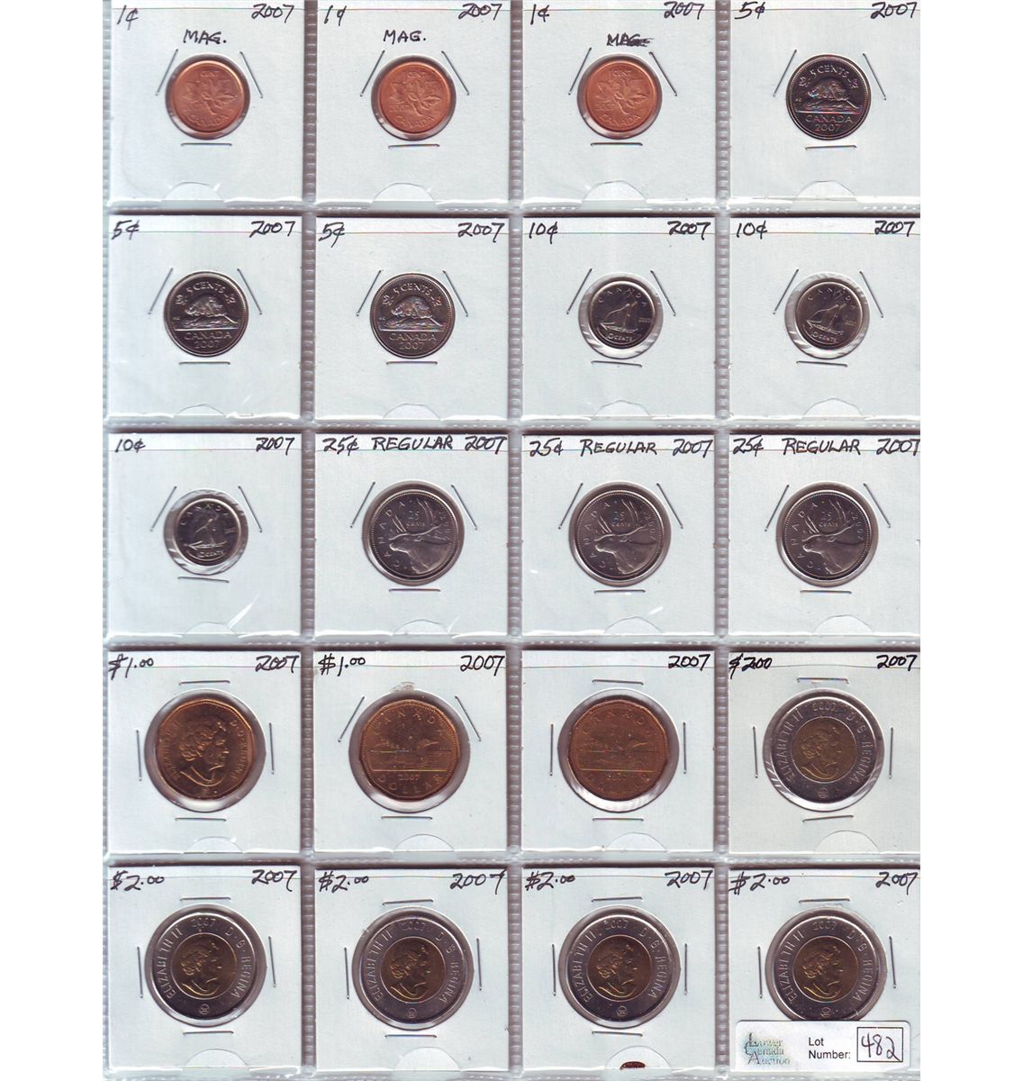 Cent 2007 Logo Magnetic x 3, 5 cents 2007 Logo x 3, 10 cents 2007 Logo x 3, 25 cents 2007 Logo x 3, 1 dollar Loon 2007 Logo x 3 & 2 dollars 2007 Logo x 5 all BU in 2x2 in a page. Lot of 20 coins with a face value of $14,23.