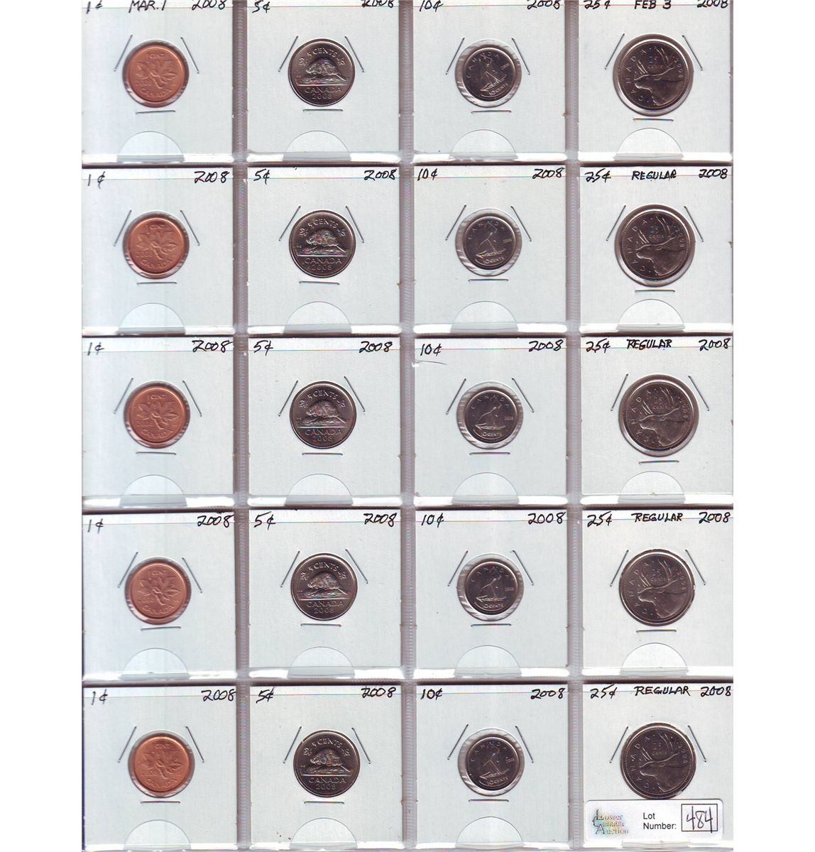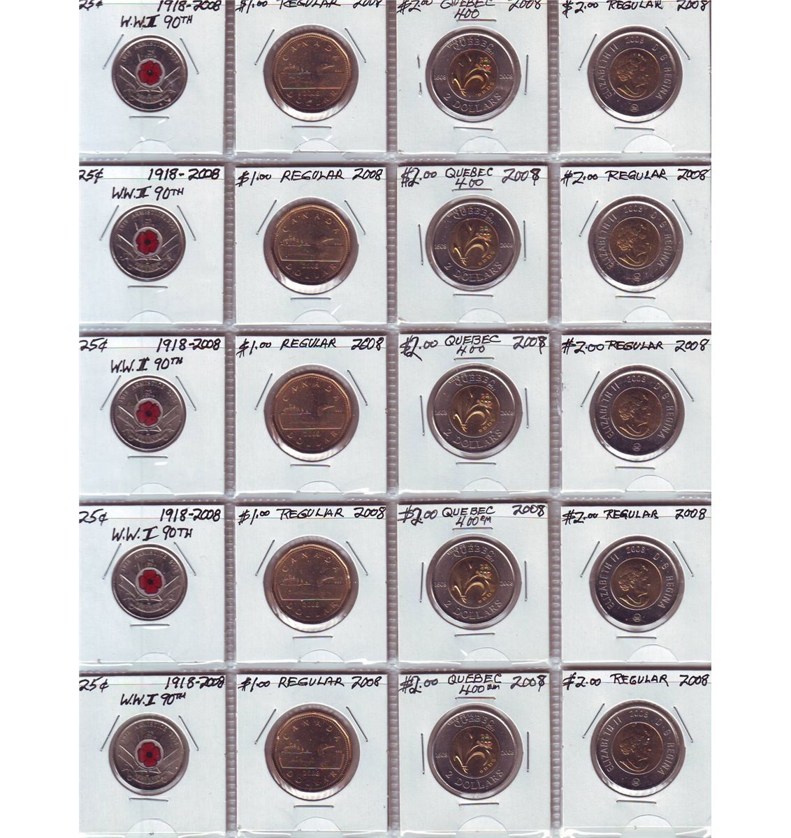Cent 2008 Logo Magnetic x 5, 5 cents 2008 Logo x 5, 10 cents 2008 Logo x 5, 25 cents 2008 Logo x 5, 25 cents 2008 Logo Red Poppy x 5, 1 dollar 2008 Logo Loon x 5, 2 dollars 2008 Logo Bear x 5 & 2 dollars 2008 Logo 400th Quebec x 5 all BU in 2x2 in pages. Lot of 40 coins with a face value of $28,30.