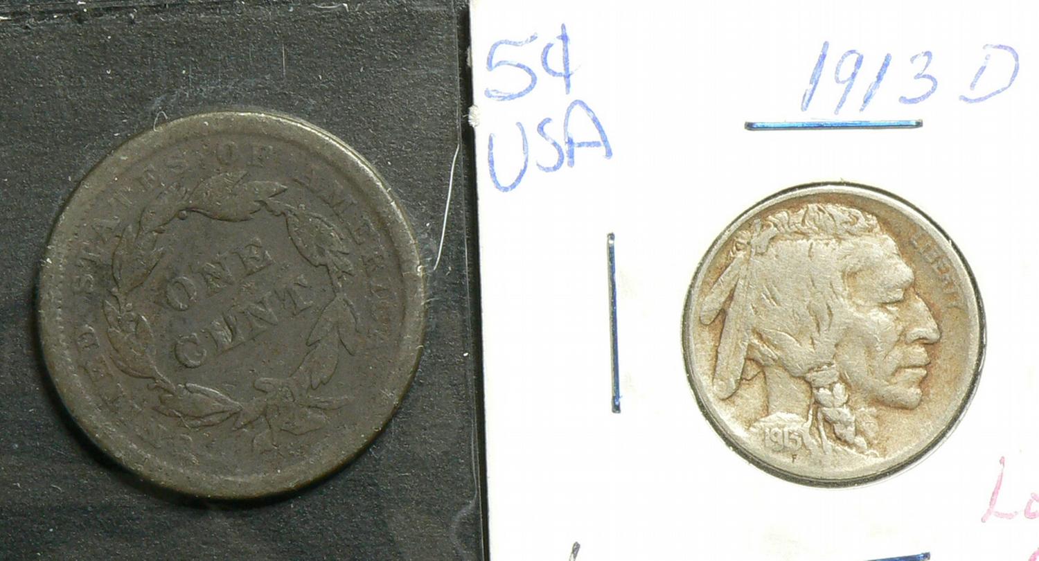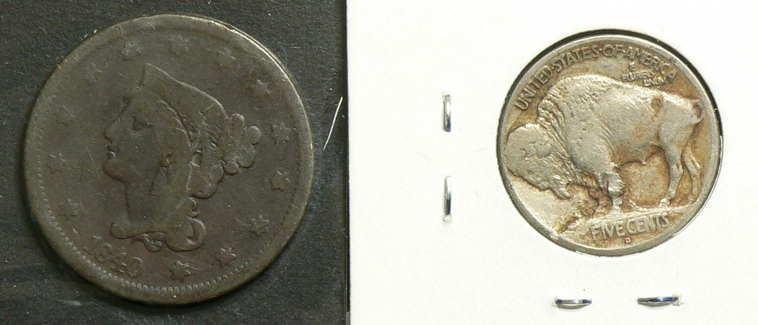 Cent USA 1840, grade VG ''Large date'' & 5 Cents 1913D, grade VG . Lot of 2 coins