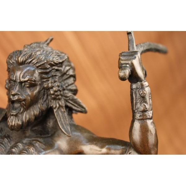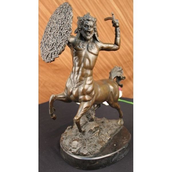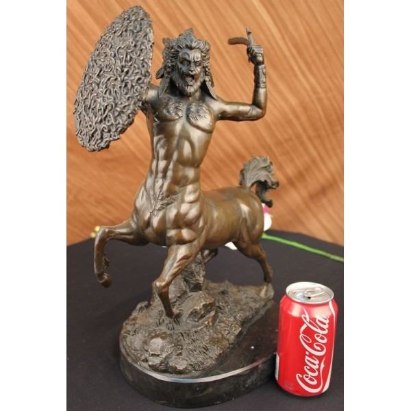 The powerful centaur comes barreling out of the realm of Greek mythology wielding a sword and shield of snakes in hand. His powerful hooves beat down on the ground as a yell of defiance rips through his human chest and mouth. His mane-like hair is adorned with feathers that fall out as he cuts through the wind. This half-human and half-animal composition create a fierce dualism in presence showing this wild, untamed spirit. This bronze sculpture was cast using the ancient method of lost wax casting and stained with a brown patina finish and It is mounted upon a marble base. Dimensions: Height 17 X Width 15 inches. Weight: 24 LBS.