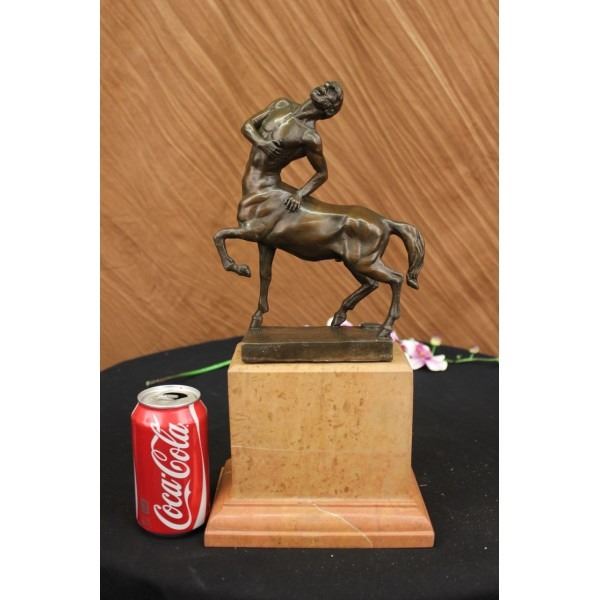 The centaur is a mythological creature, half man, half horse. This centaur arches and turns his head to the sky, questioning the heavens. He rests his hand on the body and lifts one of his four legs in the air. This great creature stands on a beautiful peach colored base giving it a very regal appearance. It was crafted using the ancient lost wax method. Bronze Dimensions with Marble Base: Height 15 X Width 8 inches. Weight: 19LBS. Please Note: This is a reproduction bronze sculpture from the original molded and signed. This featured bronze sculpture is a recast after the original, and has been done recently. This 100% bronze sculpture is an abstract piece certain to be a conversation piece.