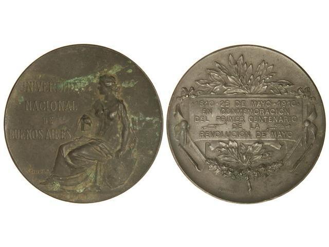 Centenari Revolución de Mayo. - 25 Mayo 1910. - UNIVERSIDAD NACIONAL DE BUENOS AIRES. ARGENTINA. - Anv.: Alegoría femenina de Argentina. Rev.: Leyenda en carte. Laurel. Br. Ø 52 mm. (Oxidaciones). EBC-. - -